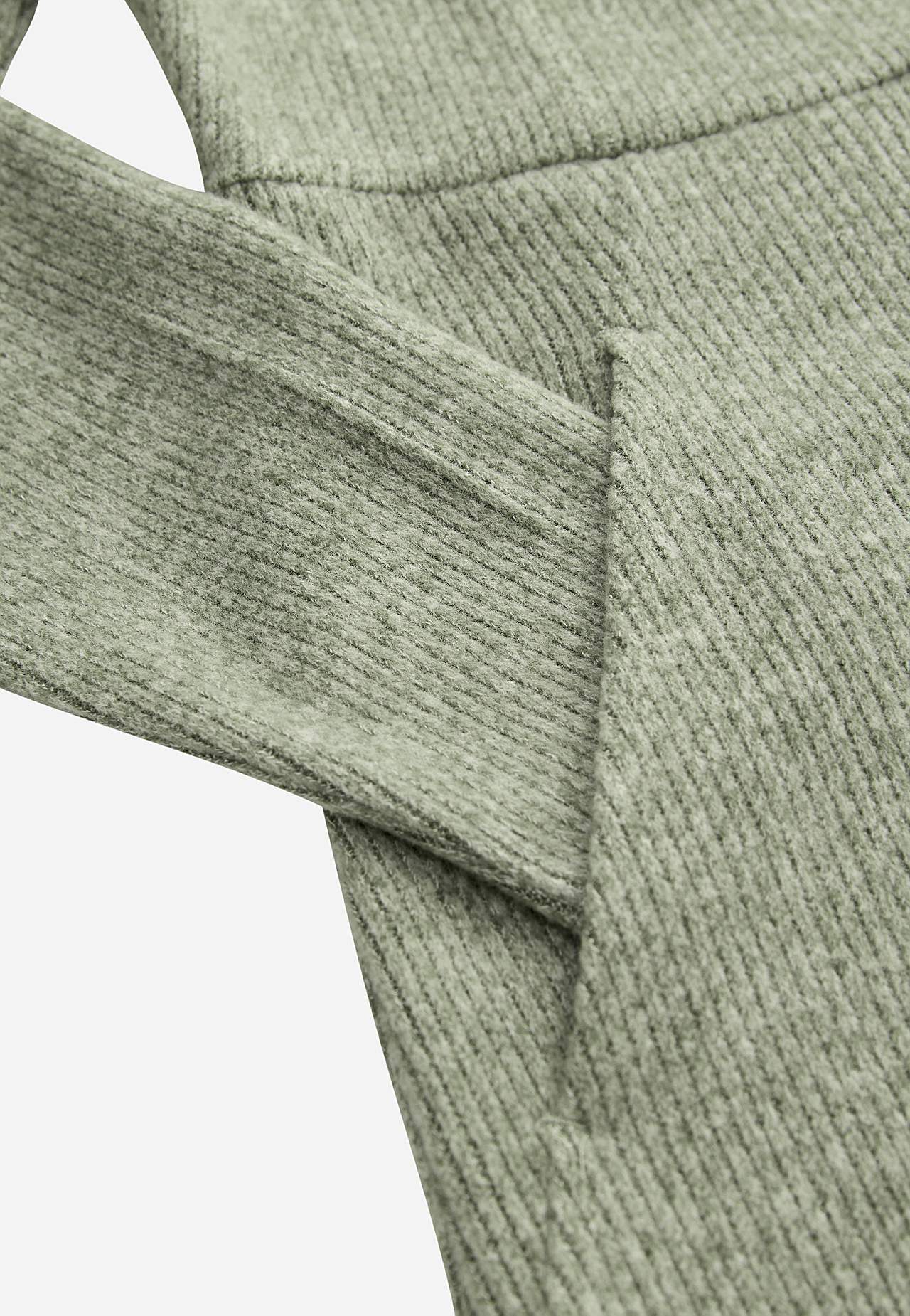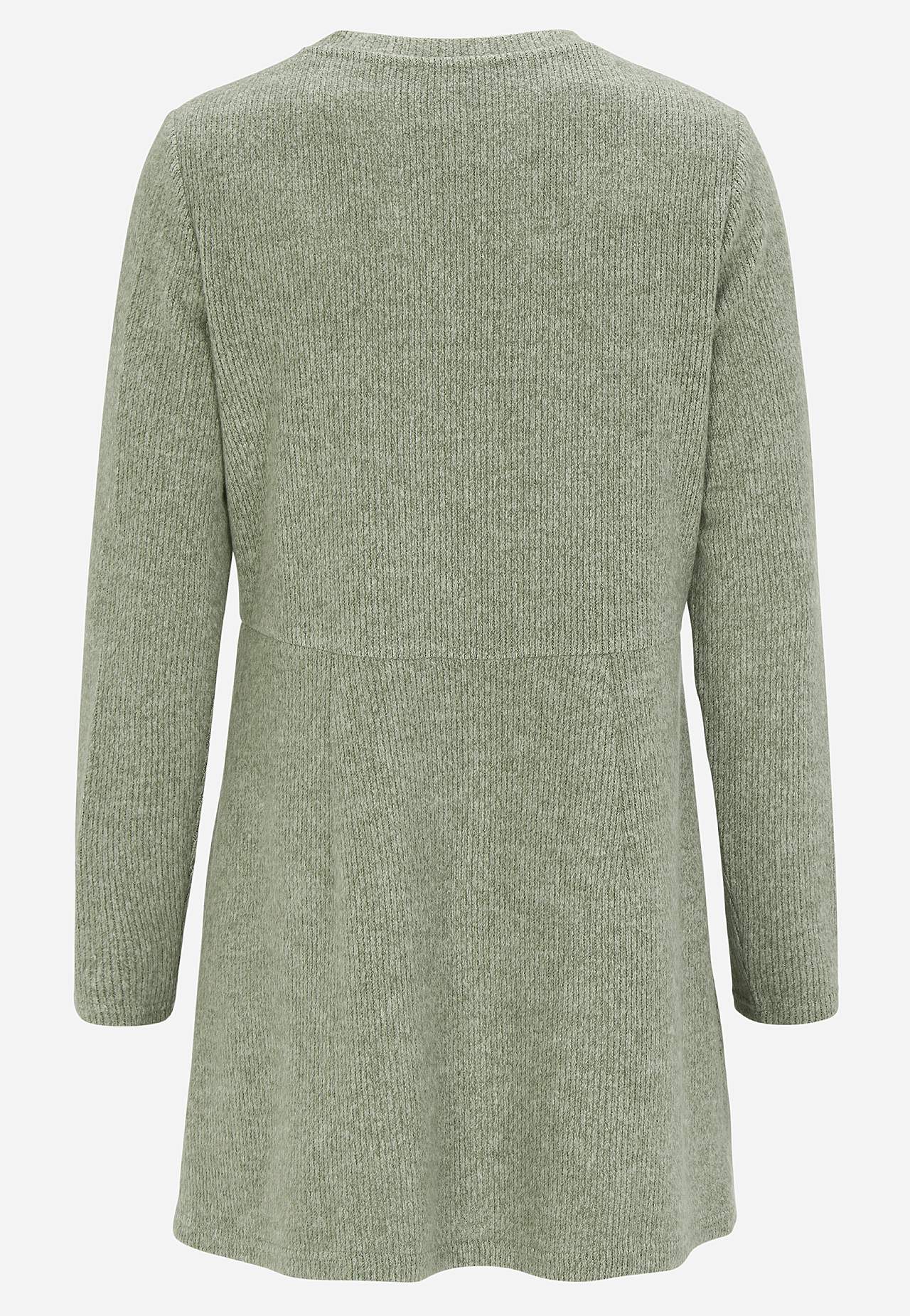 Mjuk, stickad tunika. Stretchigt, ribbat material med borstad yta. Rak passform. Rundhalsad. Figursömmar fram med insydda, dolda fickor. Dekorativ, horisontell mittsöm. Långa, raka ärmar. Lätt rundad nederkant. Längden följer storleken ca 80-91 cm cm från axeln.