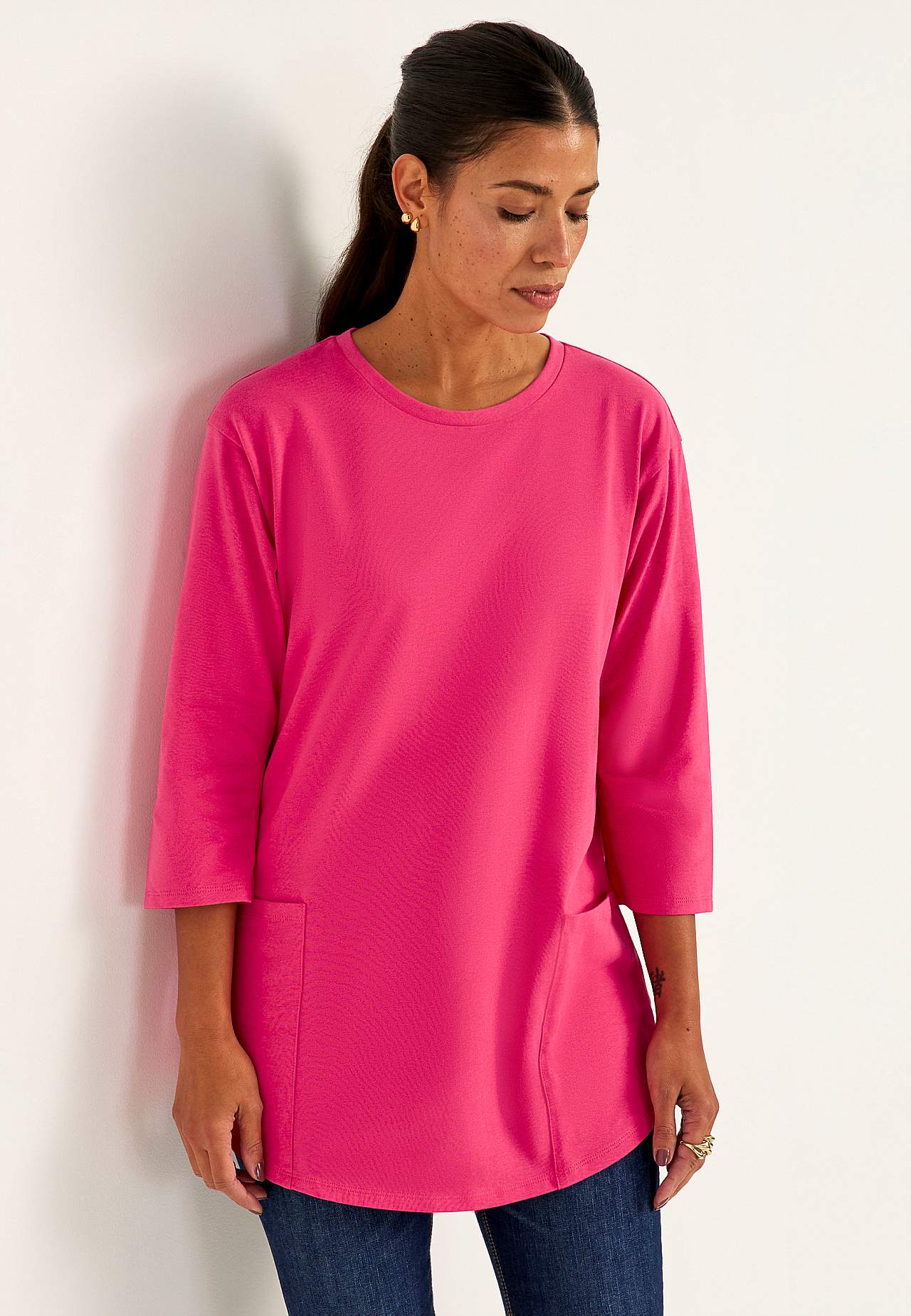 Tunika med bekväma, stora fickor. Mjuk, stadig, lite kraftigare kvalitet. Oversized passform. Rund, ribbad halsringning. Nedhasad axel. 3/4-långa, något vidare ärmar. Stora påsydda framfickor. Rundad nederkant. Längden följer storleken ca 78-92 cm från axeln.