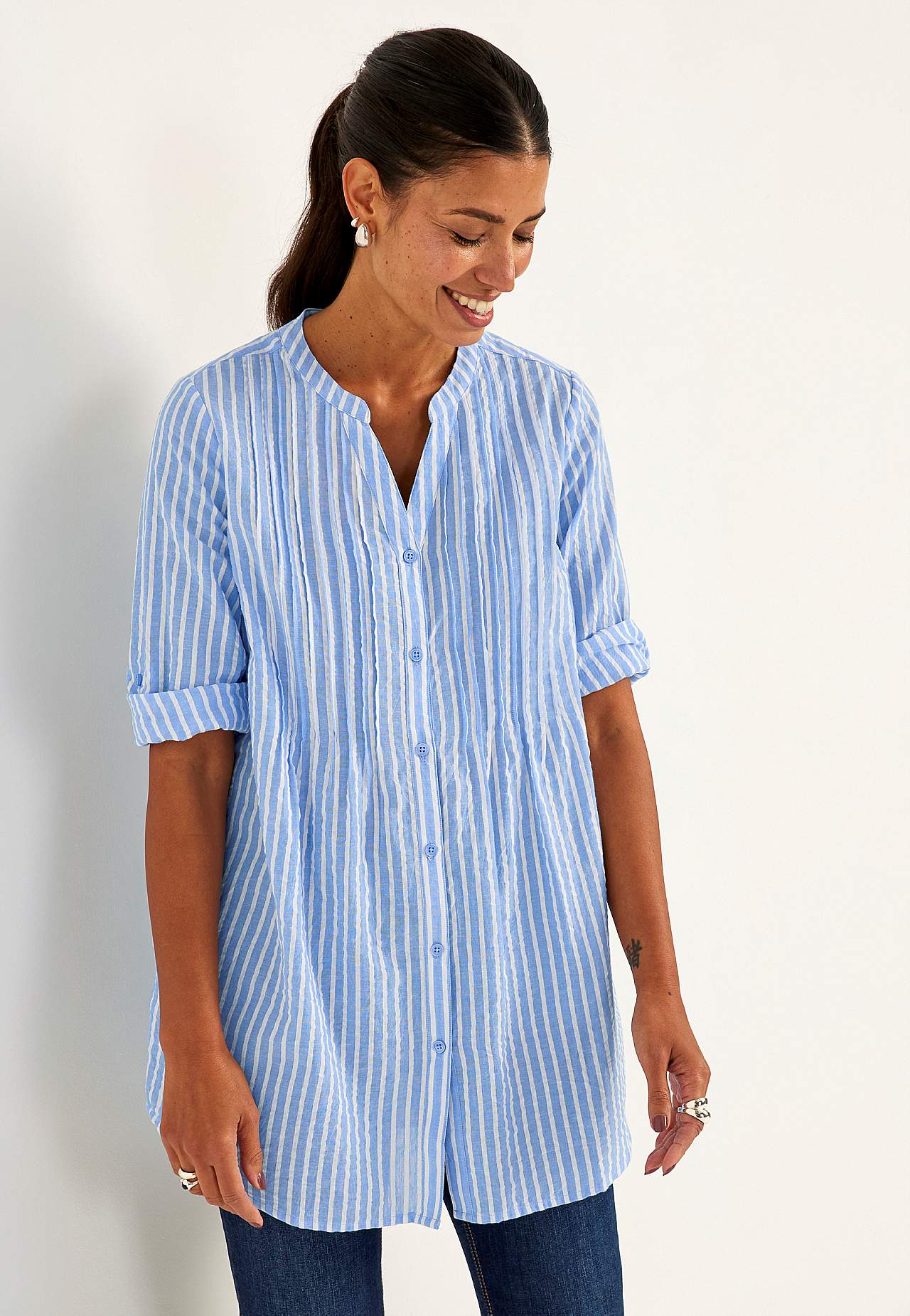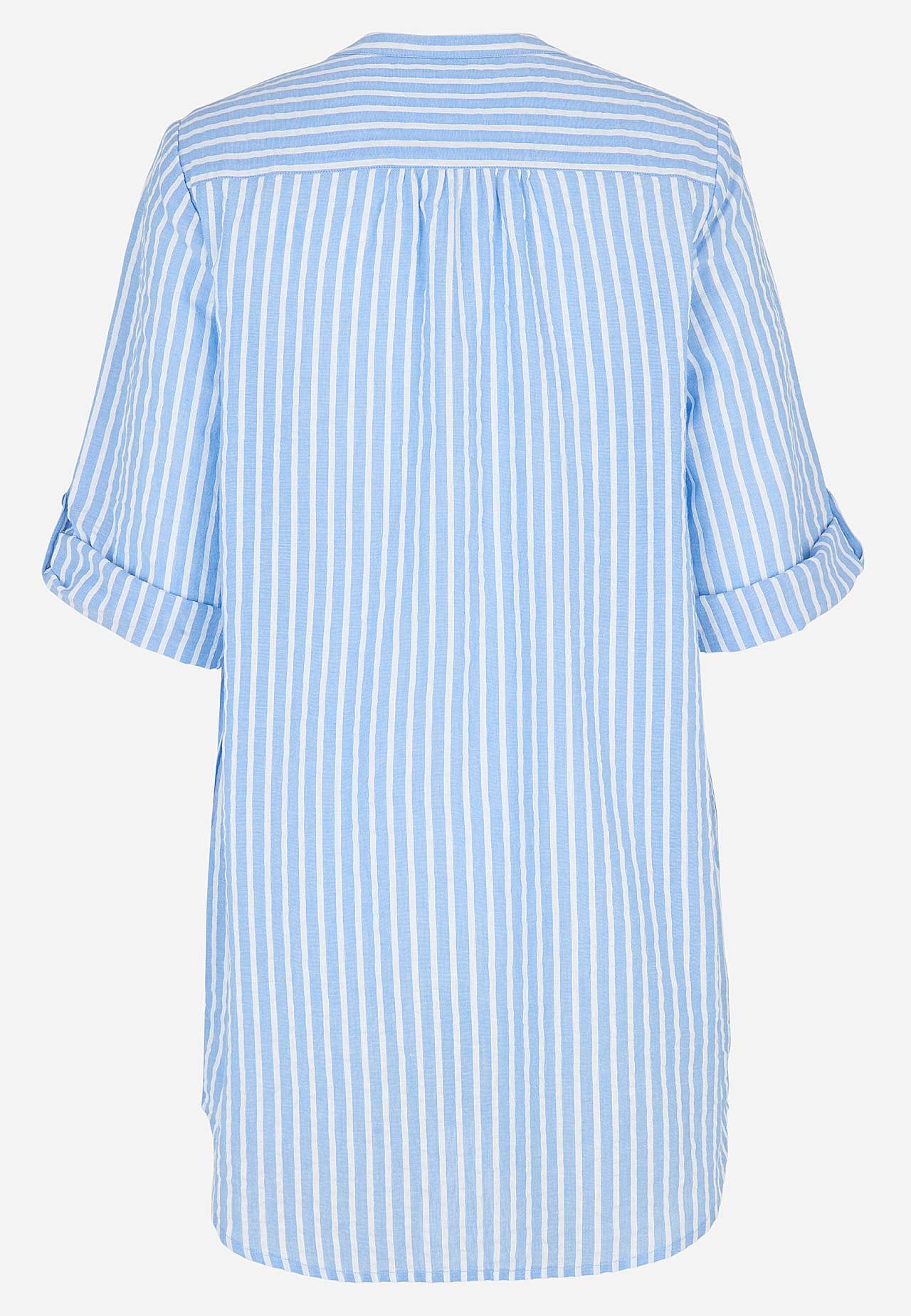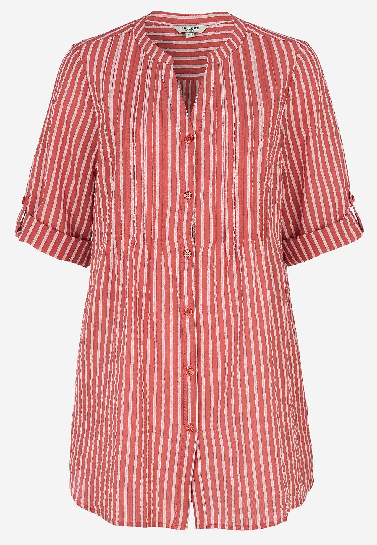 Luftig långskjorta med dekorativa stråveck. Härligt material i bäckebölja. Rund halsringning med v-formad öppning. Knappstängning. 3/4-lång, vid uppvikningsbar ärm med knapp. Dolda fickor i sidan. Ok bak med rynkdetaljer. Längden följer storleken ca 82-94 cm från axeln.