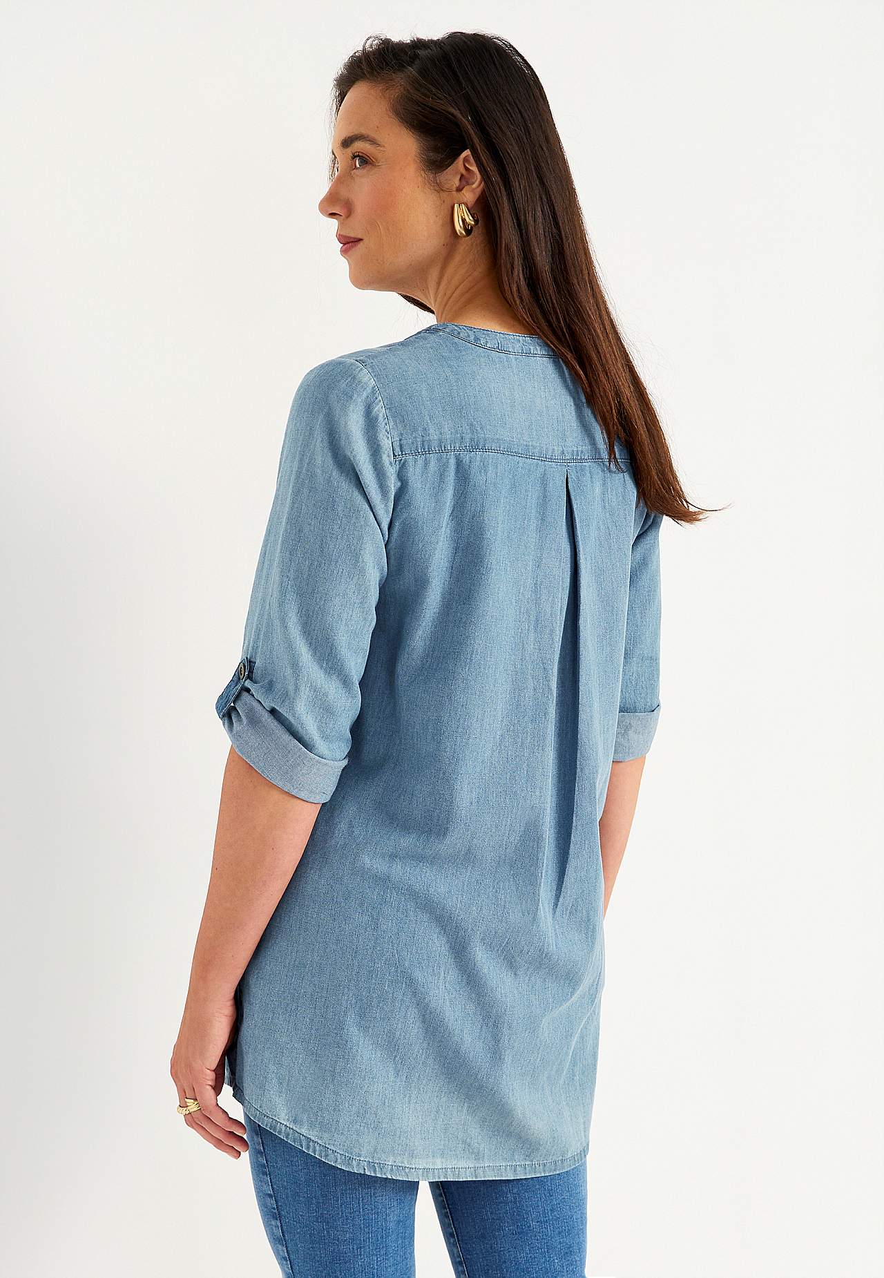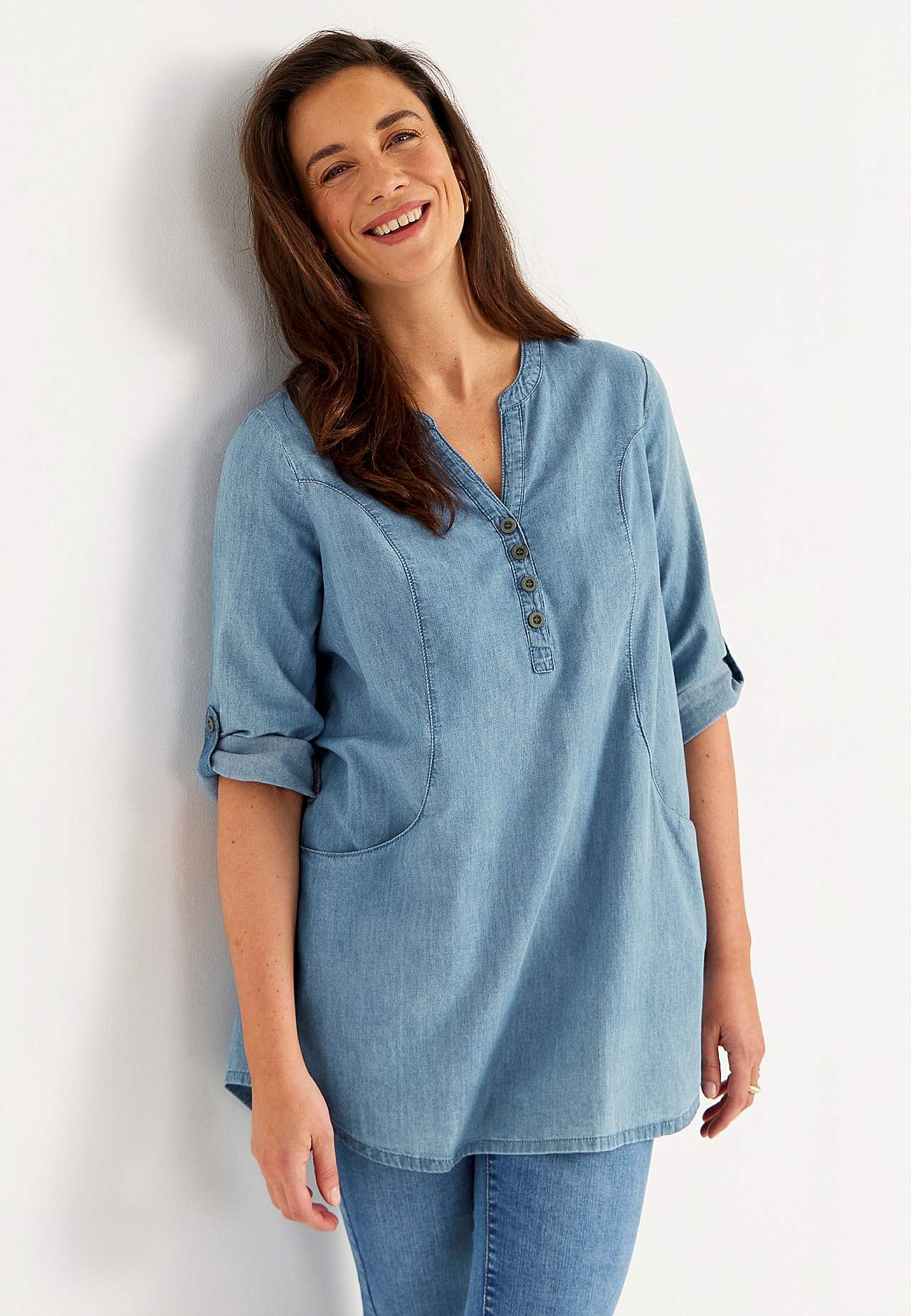 Lätt a-linjeformad tunika i mjuk denim. Rundhalsad med v-ringning och knappslå. Rymliga framfickor. 3/4-långa, uppvikbara ärmar med slejf och knapp. Ok med veck baktill. Längden följer storleken ca 84-96 cm från axeln.