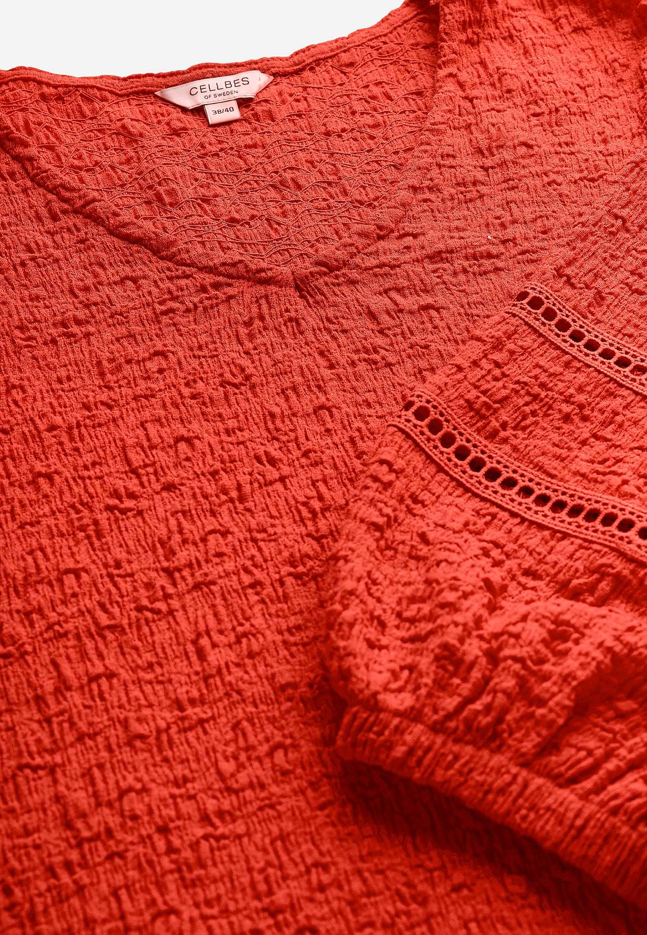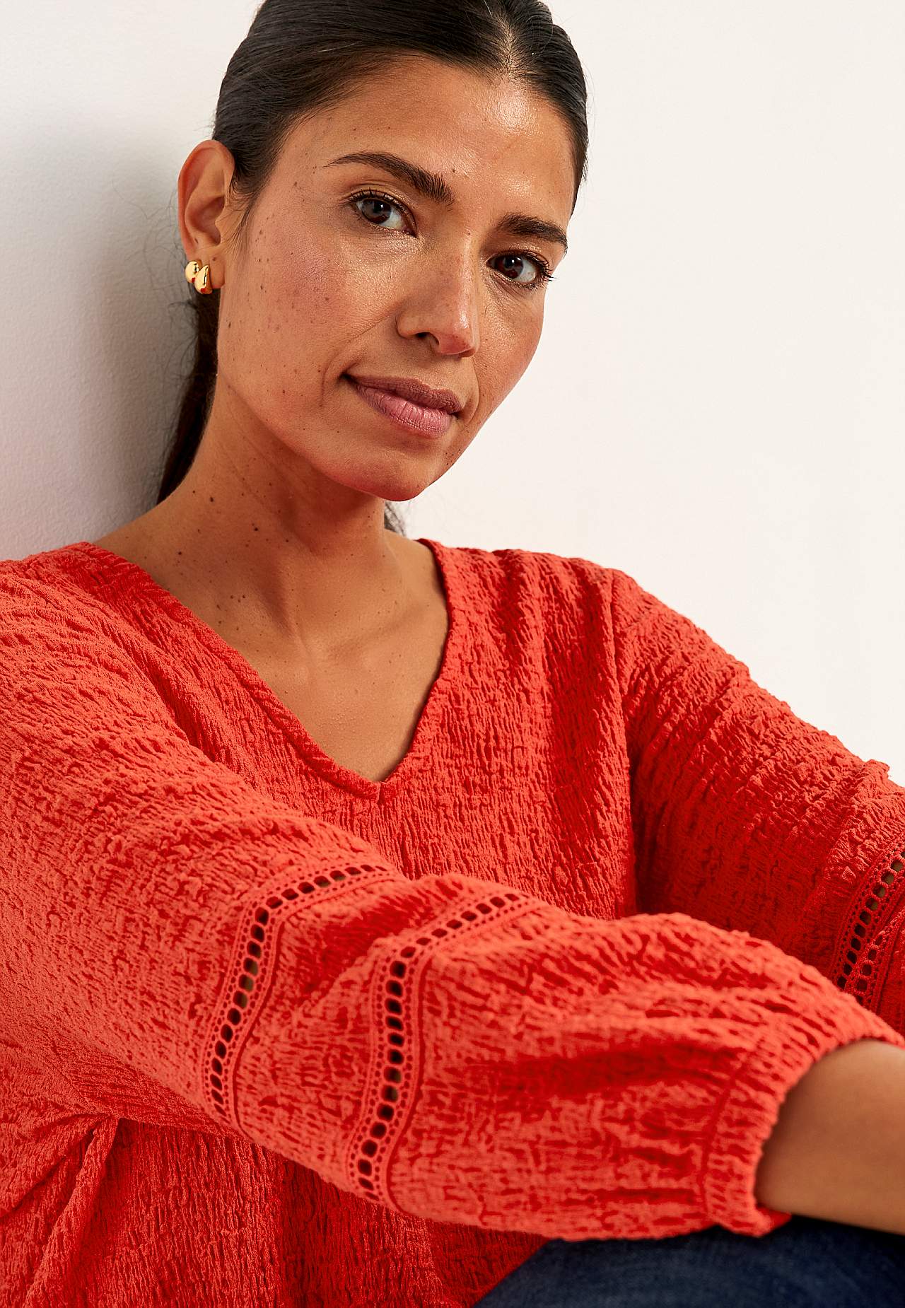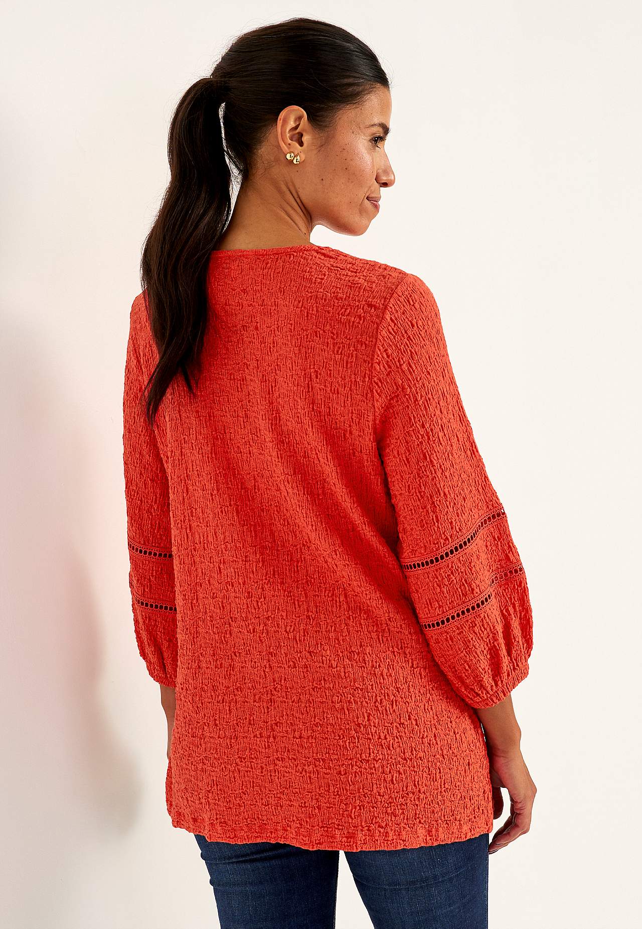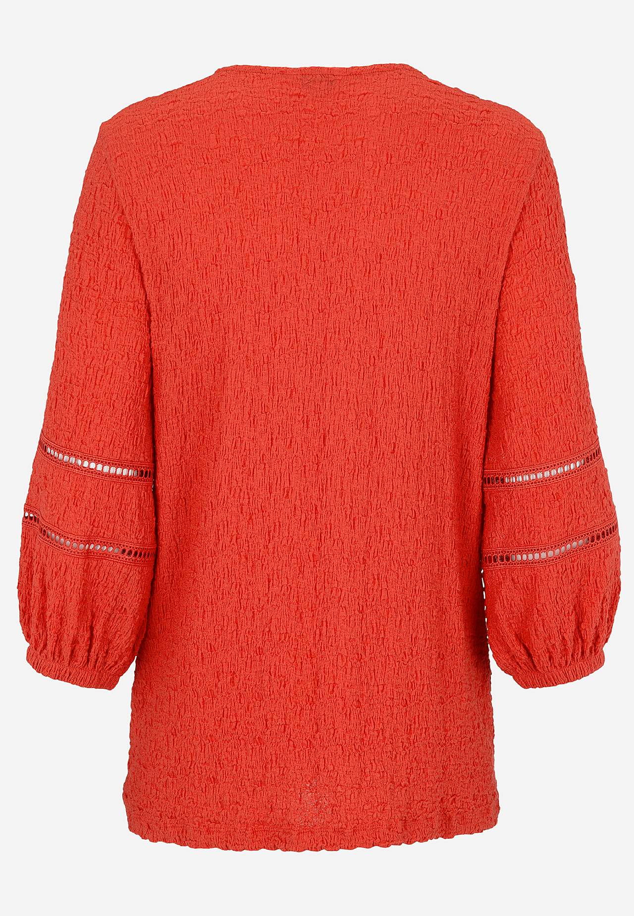 Tunika i skön, stretchig bomullsmix med struktur. Fina detaljer med hålmönster på ärmarna. Normal passform med lätt utsvängd nederdel. V-ringad hals. 3/4-långa, vida ärmar med resår i ärmsluten och dekorsömmar med hålmönster. Rak nederkant. Rygglängden följer storleken ca 72-80 cm.