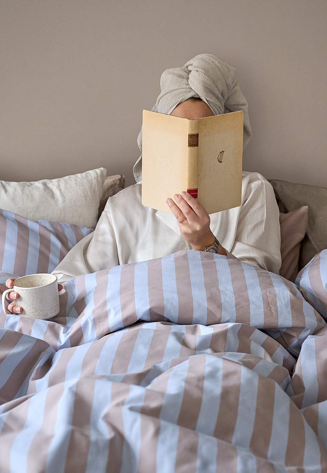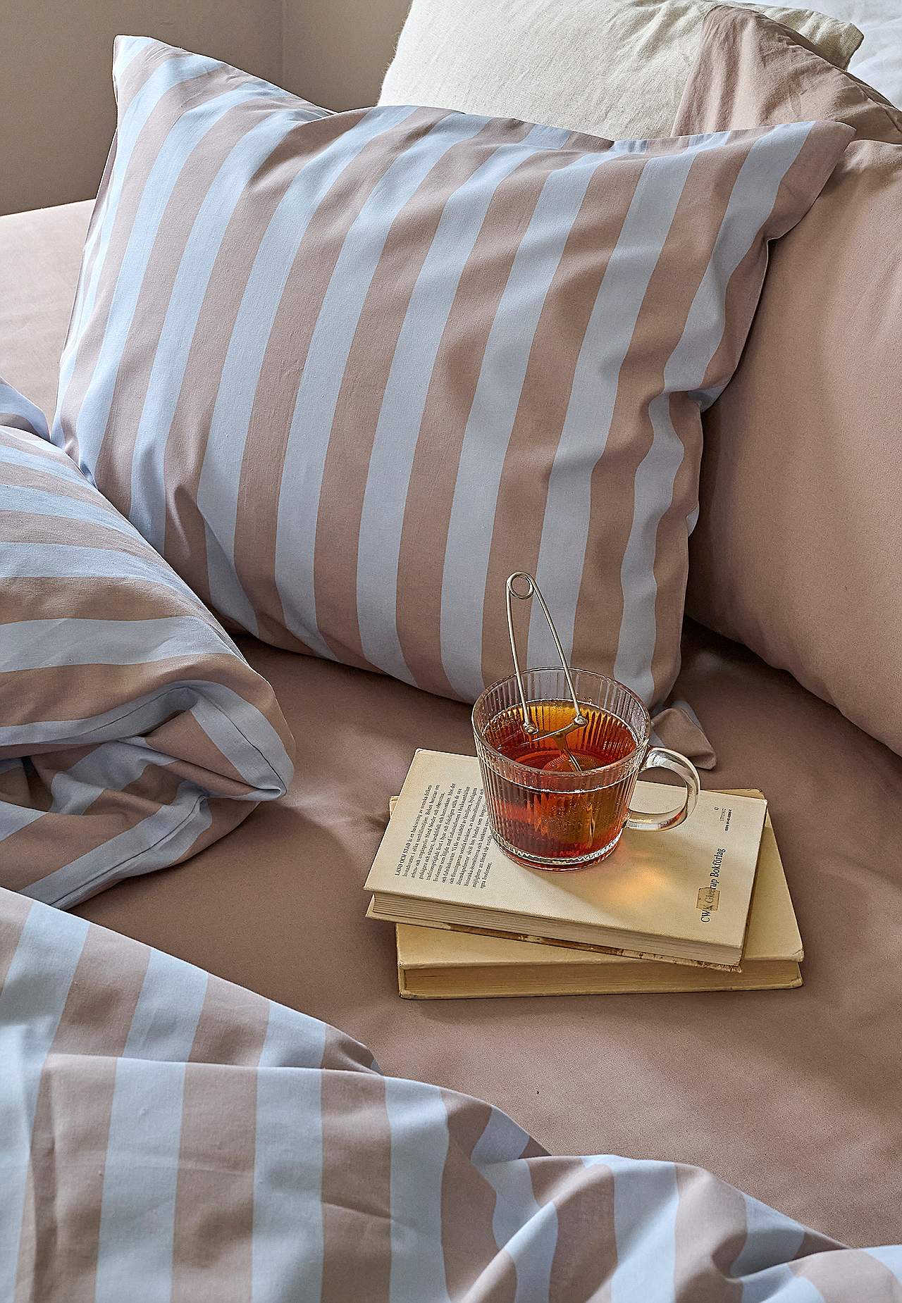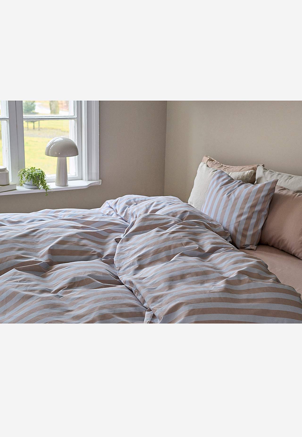 Påslakanset med tryckta ränder. Skön, mjuk bomull. Likadant mönster på fram och baksida. 2 delar för enkelsäng. Påslakan storlek 150x210 cm, örngott 50x60 cm. Påslakan med handhål upptill. Örngott med kuvertöppning. Trådtäthet: 144.