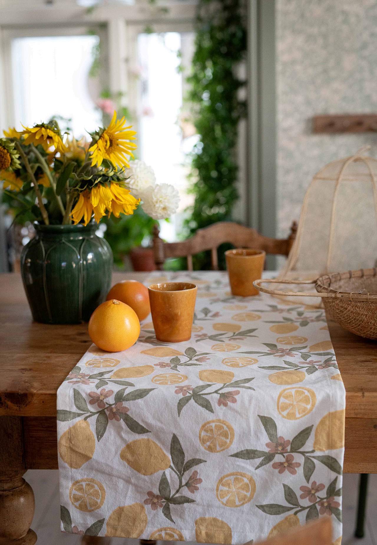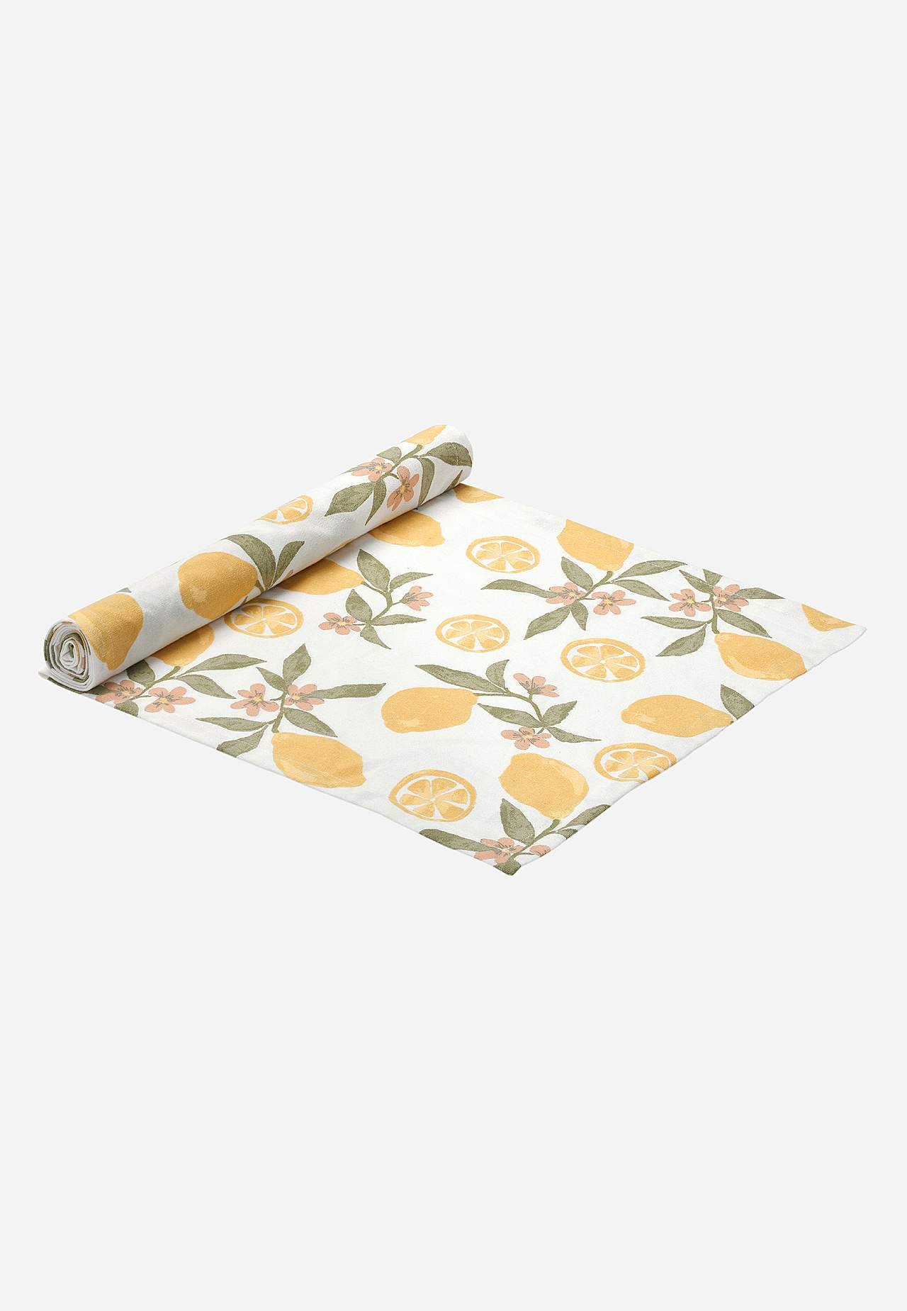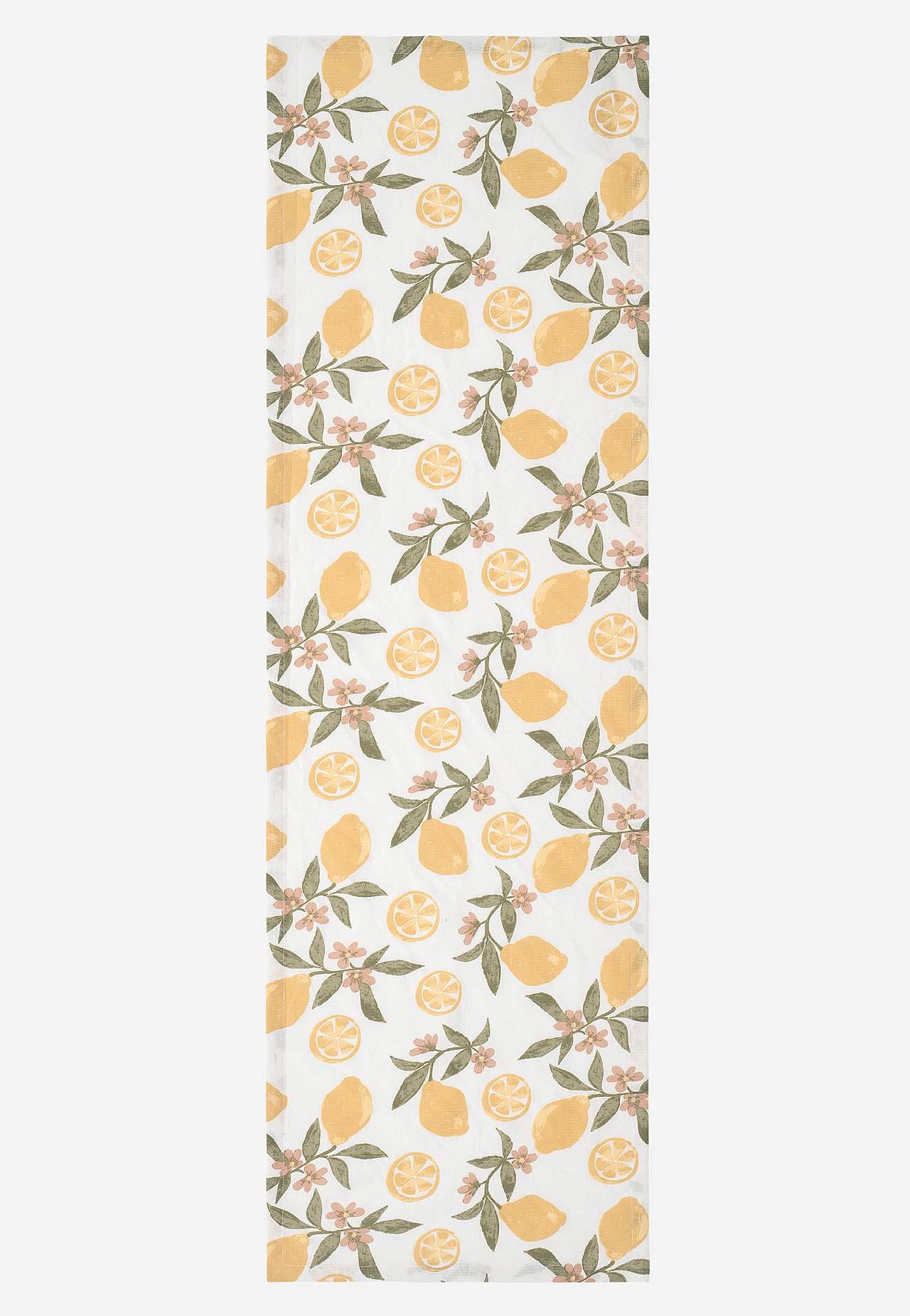 Löpare med härligt citrontryck och små blommor med blad. Slätt material i återvunnen bomull och polyester. Fåll runt om. Storlek: 40x140 cm.