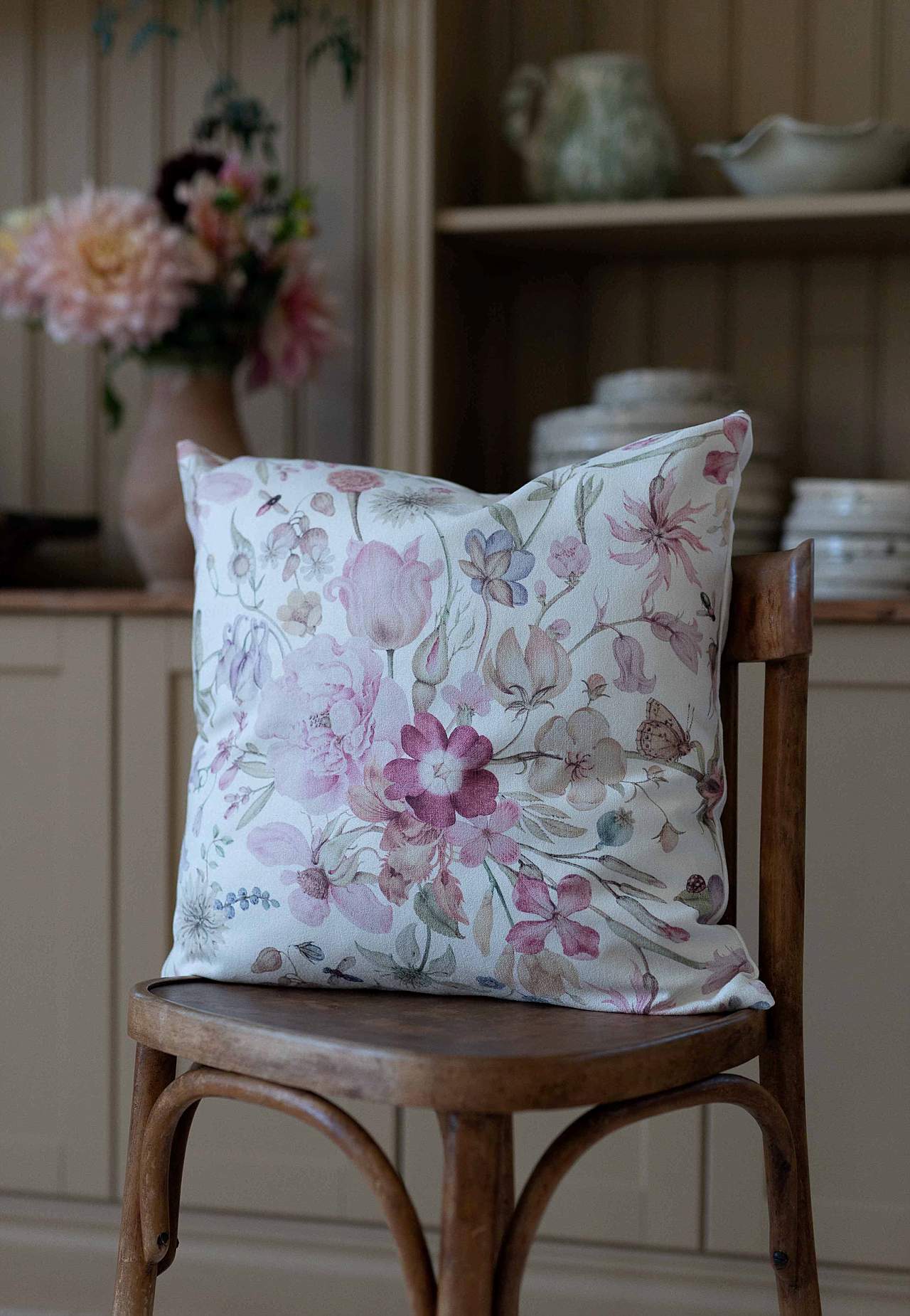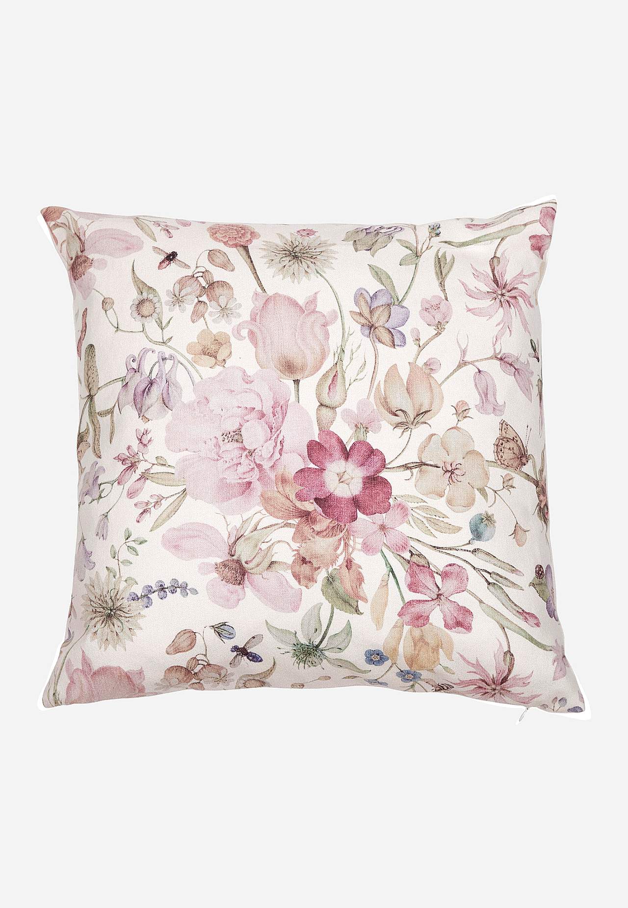Kuddfodral med blommor och fjärilar. Sammetslent material med matt yta. Enfärgad baksida. Dragkedja i sidan. Storlek: 48x48 cm.