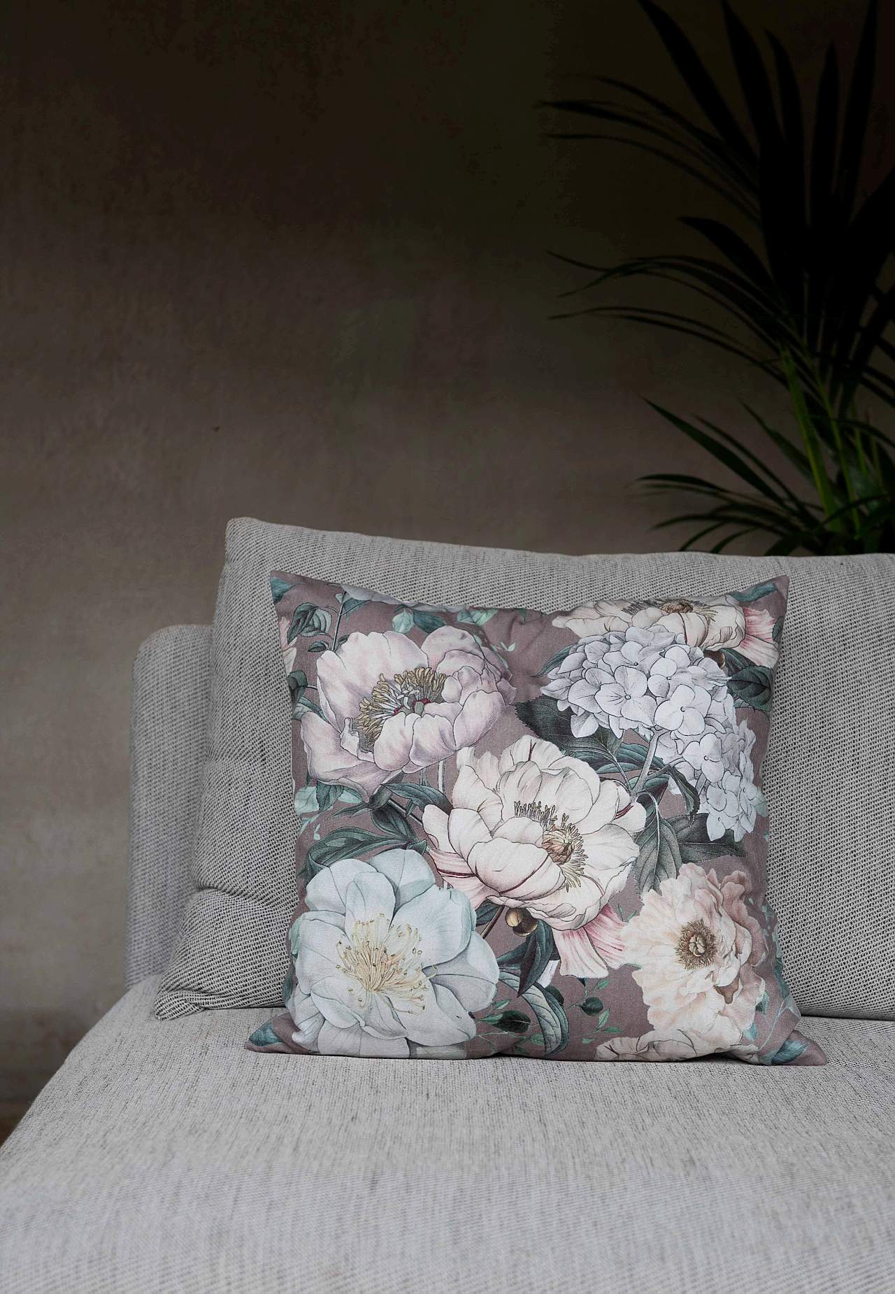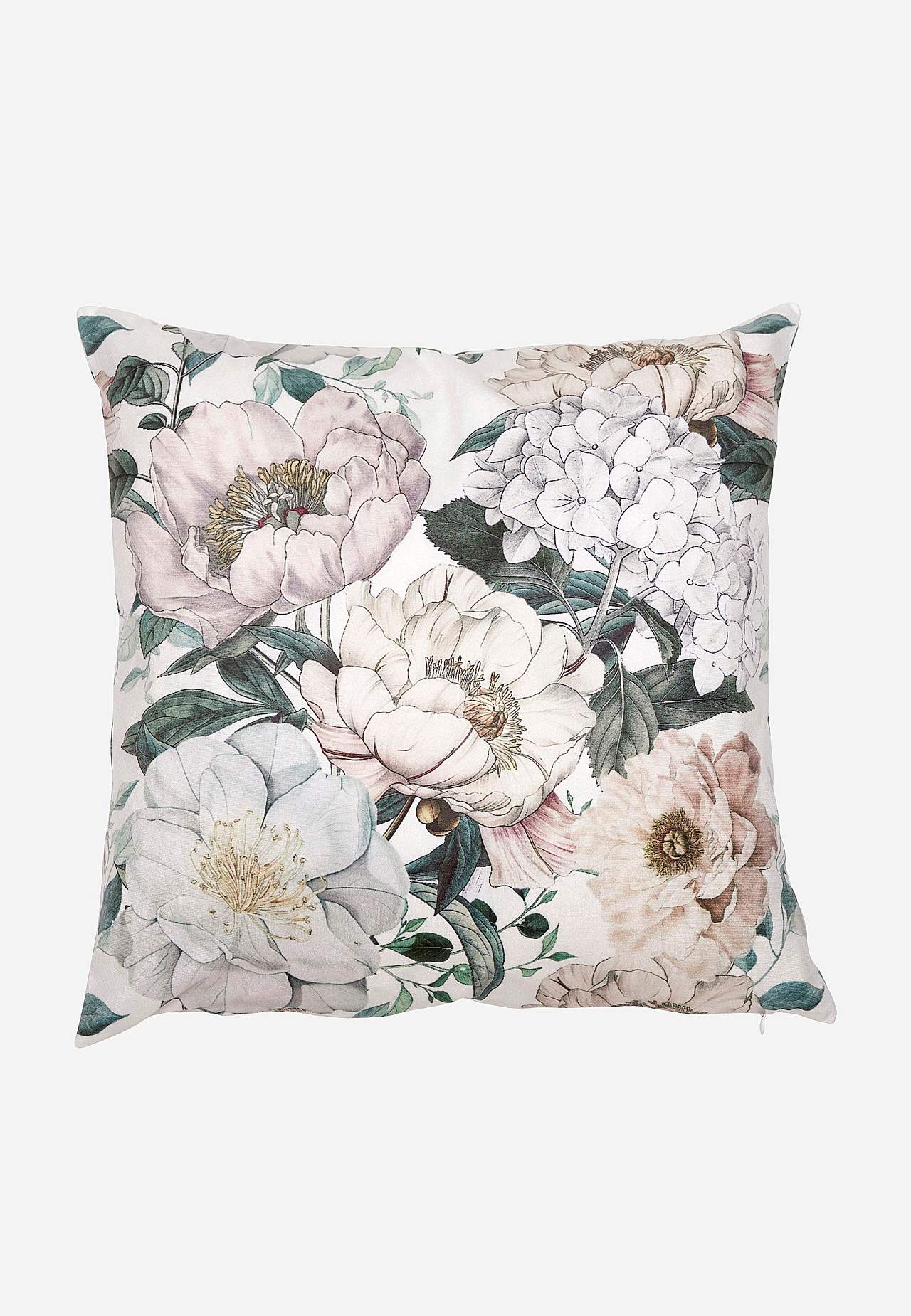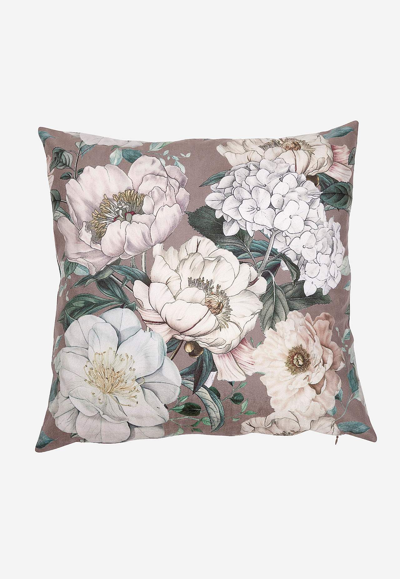 Kuddfodral med vackra pioner och hortensior. Mjukt sammetstyg i polyester. Likadant mönster på fram och baksida. Dragkedja i sidan. Storlek: 45x45 cm.