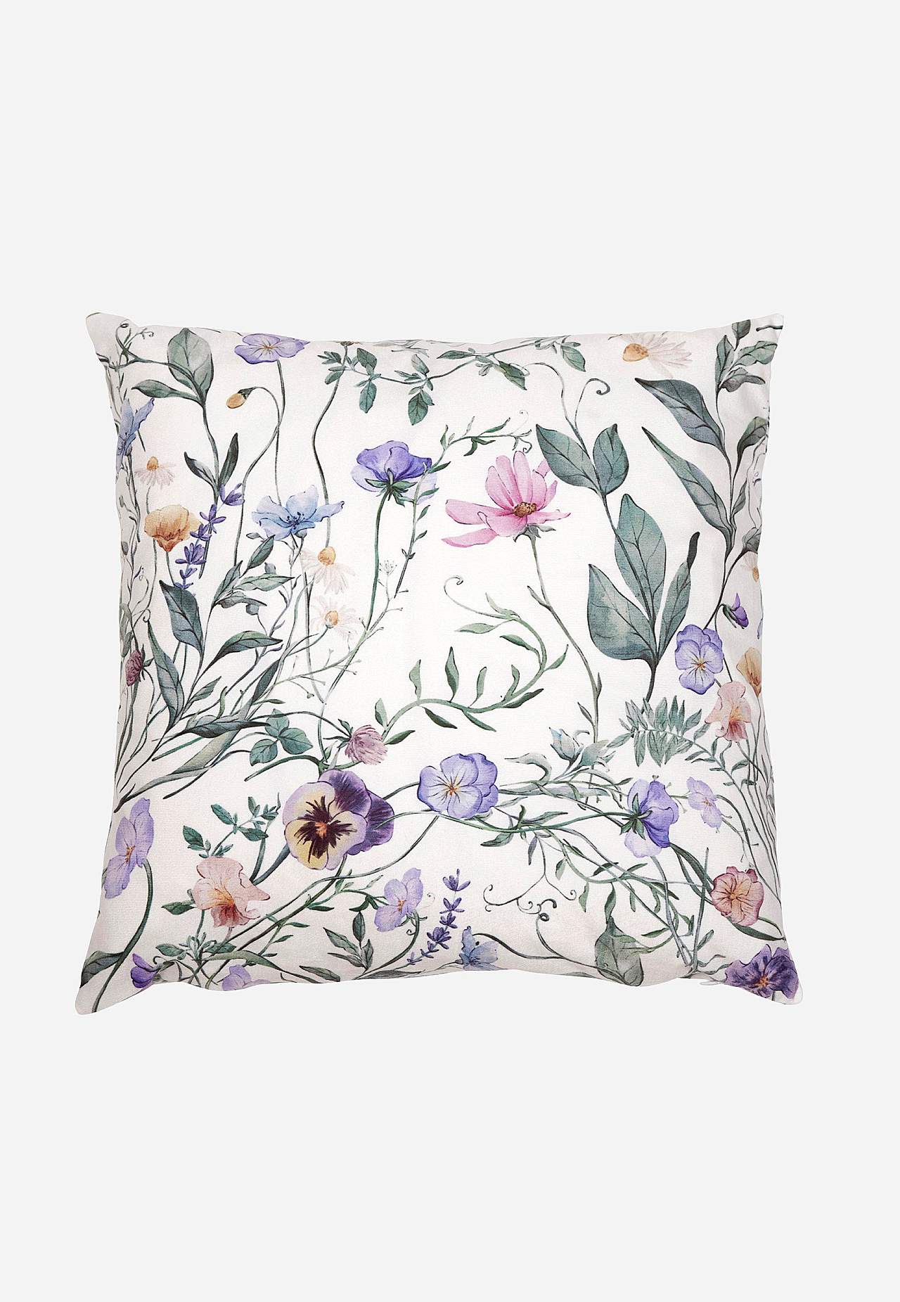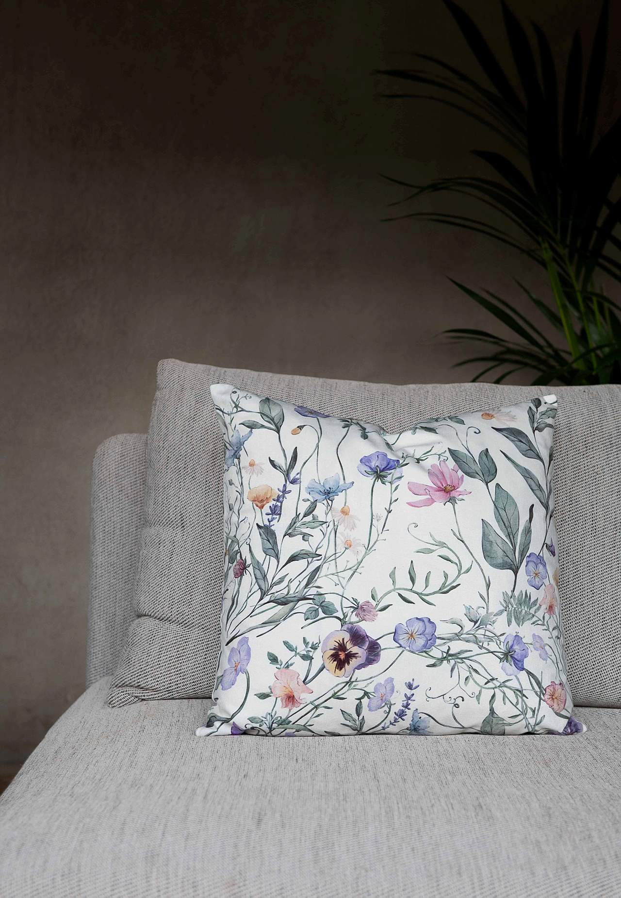 Kuddfodral med romantiska blommor, blad och slingrande stjälkar. Mjukt sammetstyg i polyester. Likadant mönster på fram och baksida. Dragkedja i sidan. Storlek: 45x45 cm.