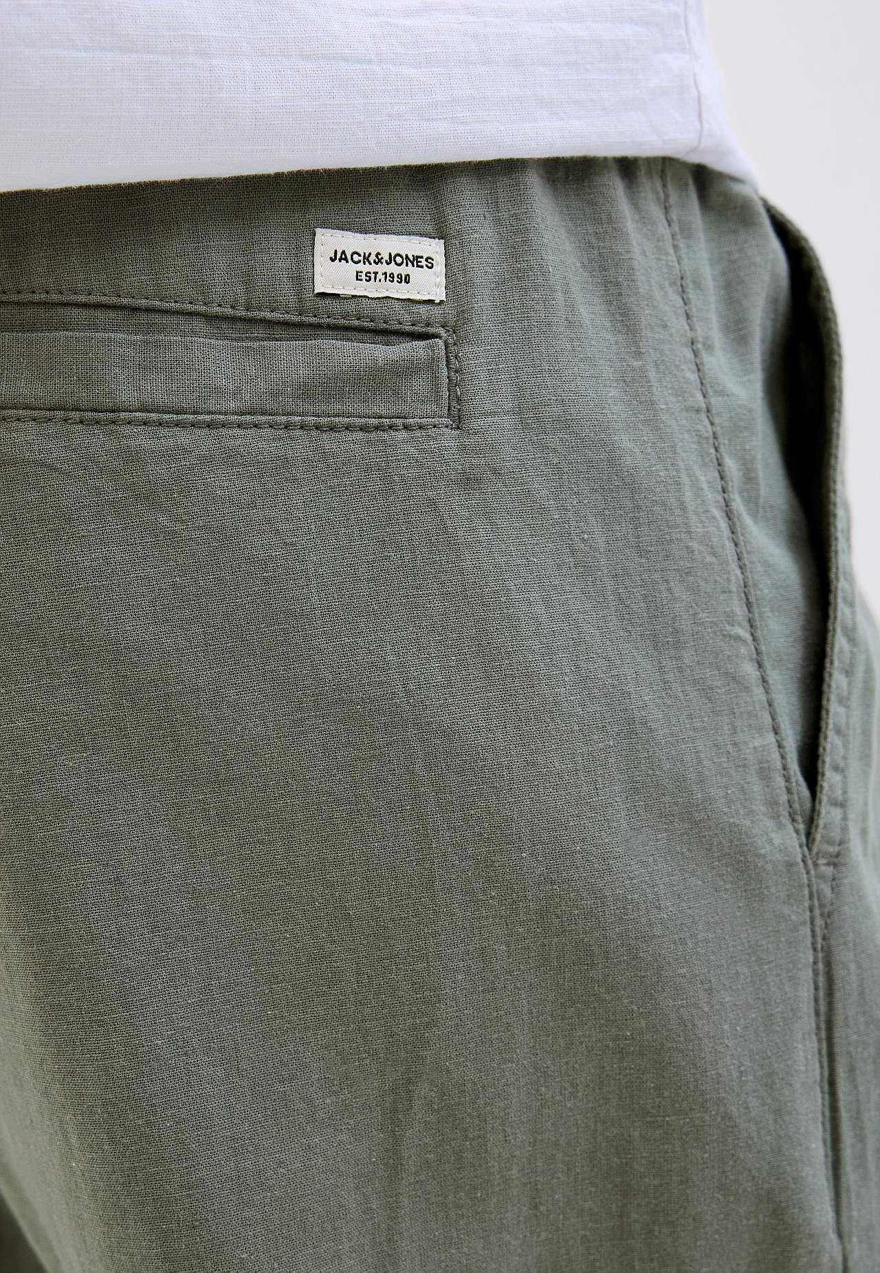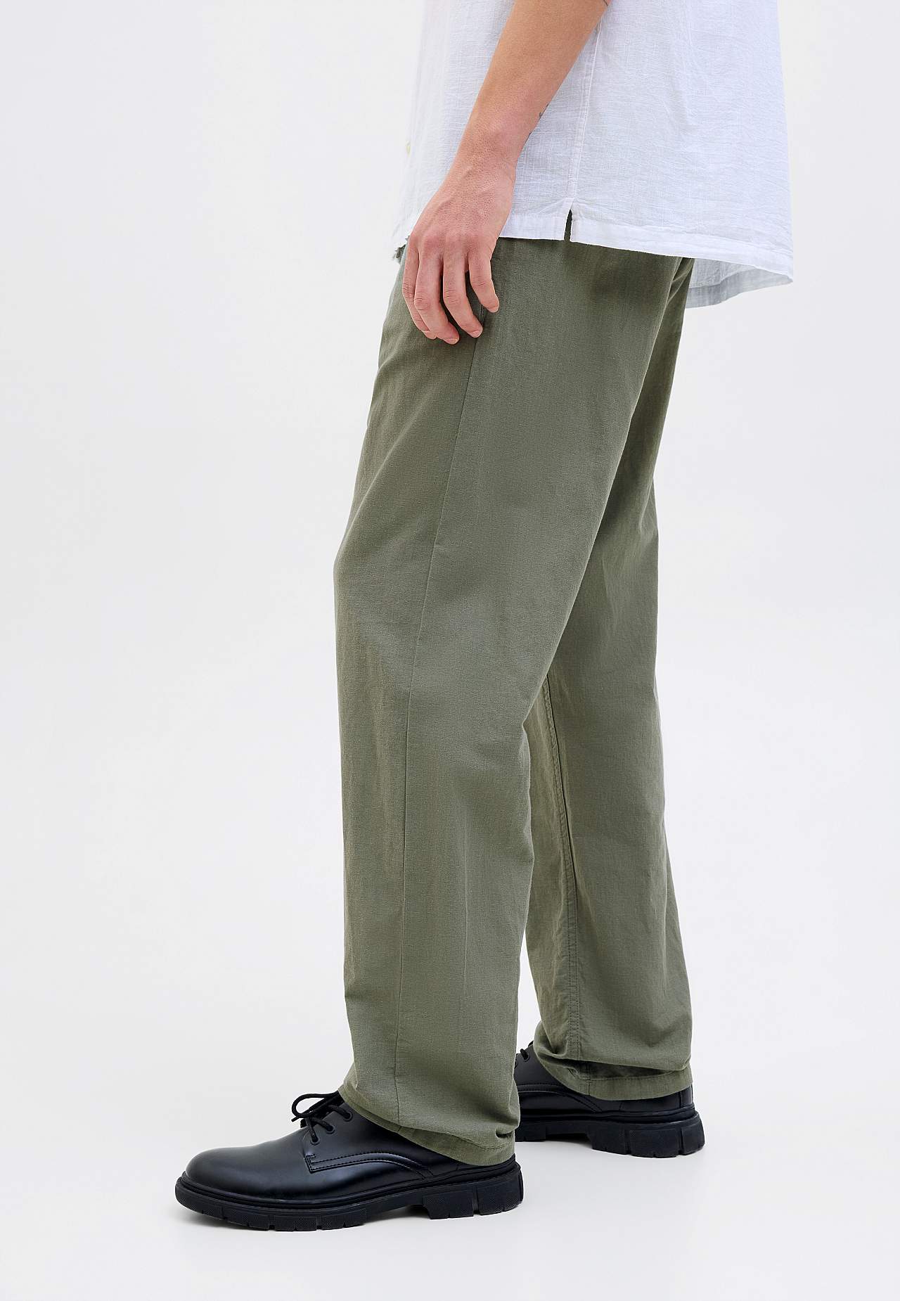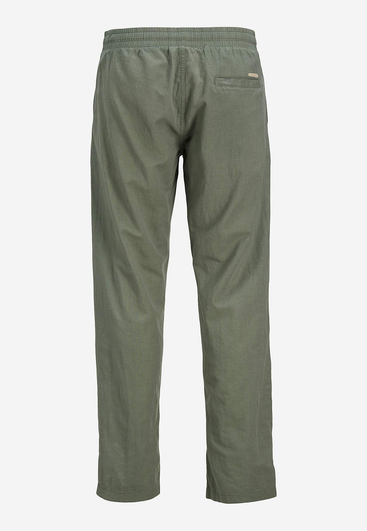Vävd byxa i sval, lite tunnare linnemix. Avslappnad passform. Dra på-modell med medelhög midja. Midja med bred resår och dragsko. Sneda framfickor. En infälld bakficka. Innerbenslängd ca 78 cm i storlek L.