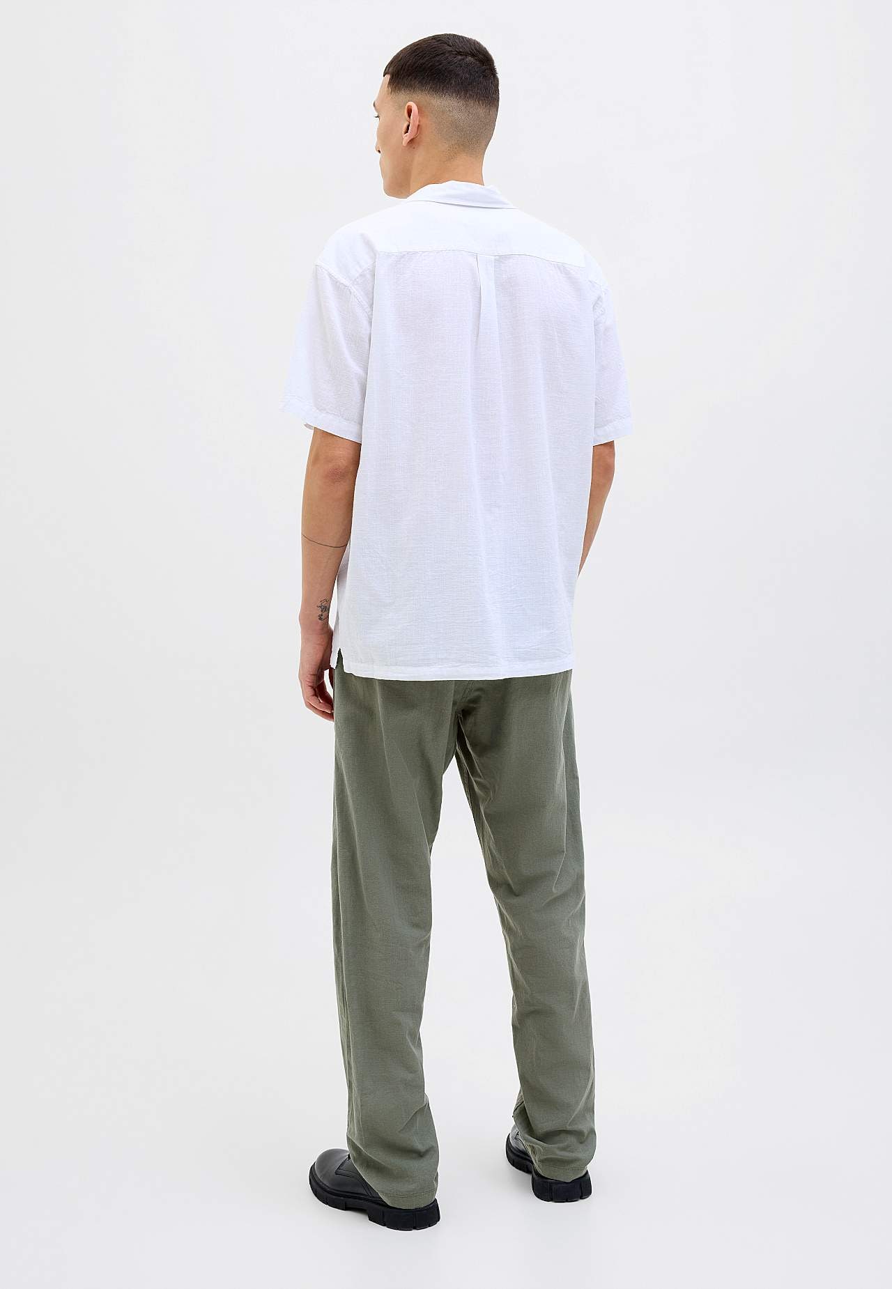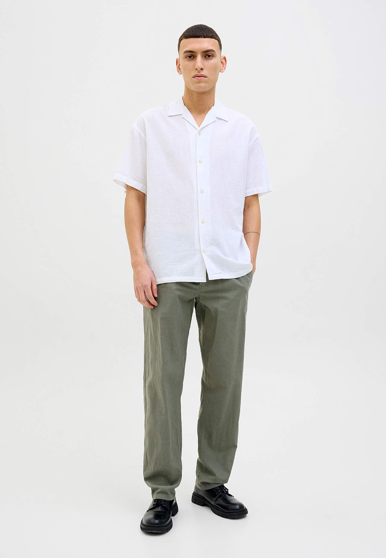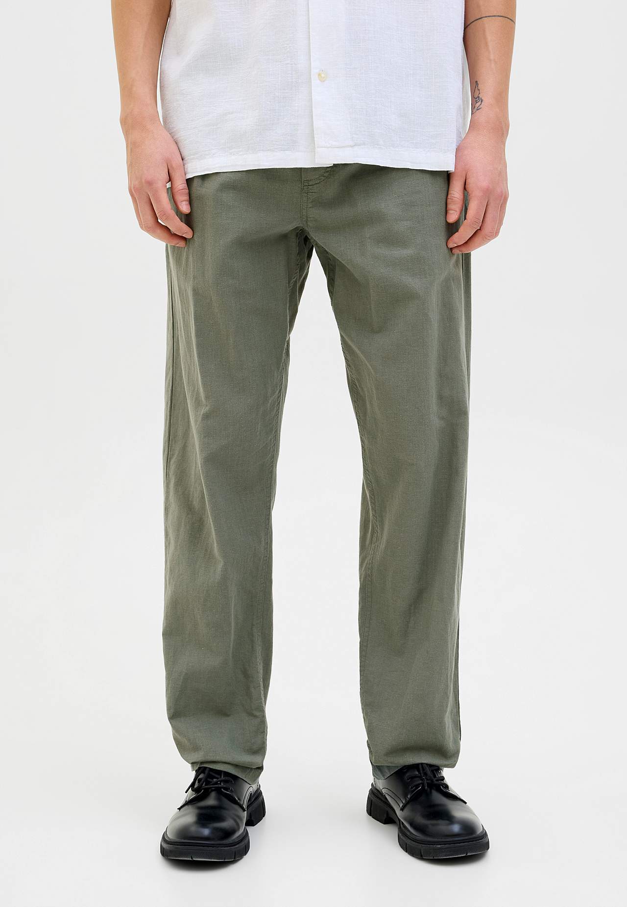 Vävd byxa i sval, lite tunnare linnemix. Avslappnad passform. Dra på-modell med medelhög midja. Midja med bred resår och dragsko. Sneda framfickor. En infälld bakficka. Innerbenslängd ca 78 cm i storlek L.