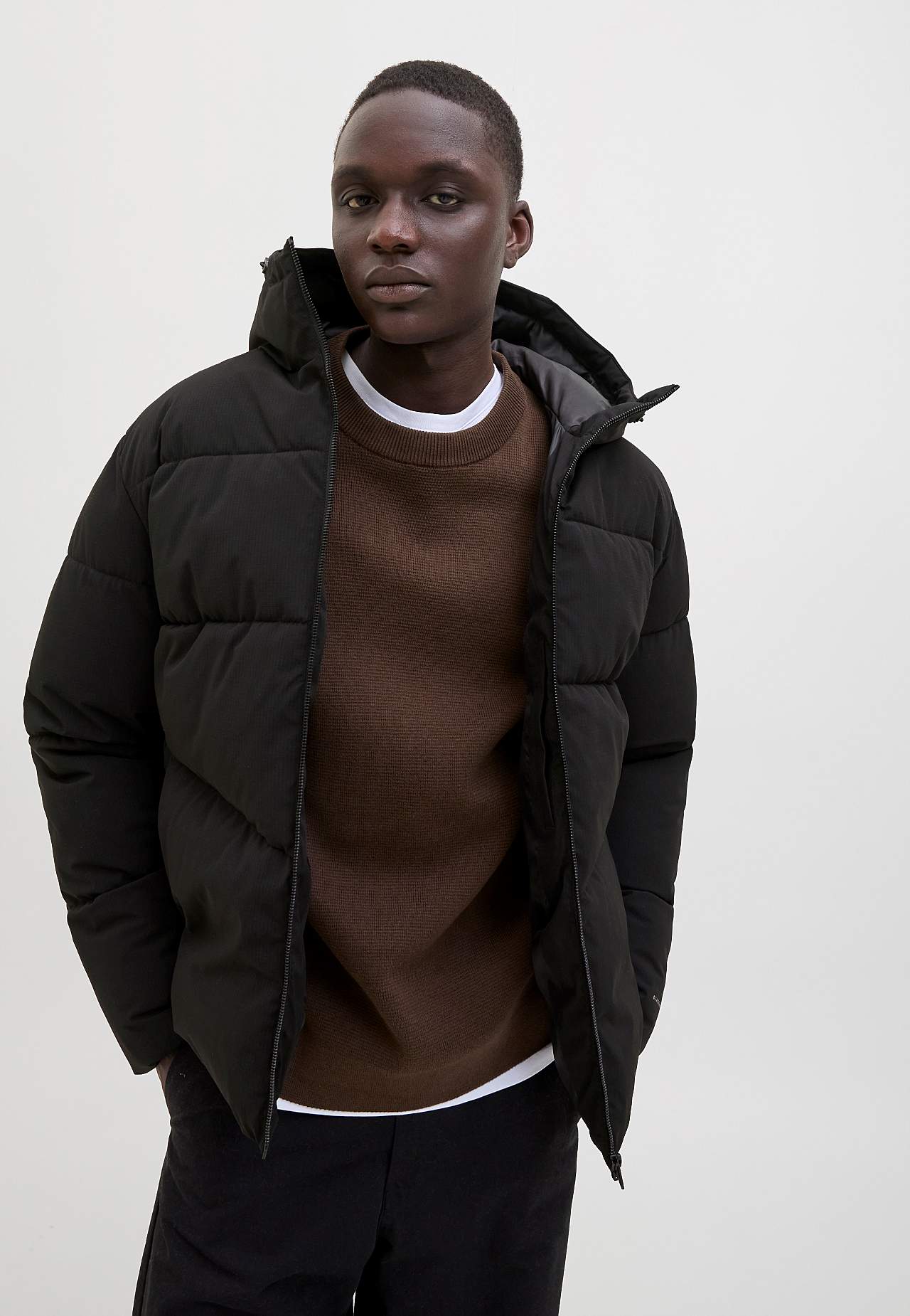 Varmfodrad pufferjacka. Yttermaterial med matt yta. Fluffig, mjuk, återvunnen polyesterfyllning. Ledig, bekväm passform. Vadderad, fastsydd huva med dragsko. Stängning med svart dragkedja. Sidofickor. Innerficka med kardborrebandsstängning. Dold resår i ärmsluten. Logga vid ärmslut. Längd från axeln ca 70 cm i storlek M.