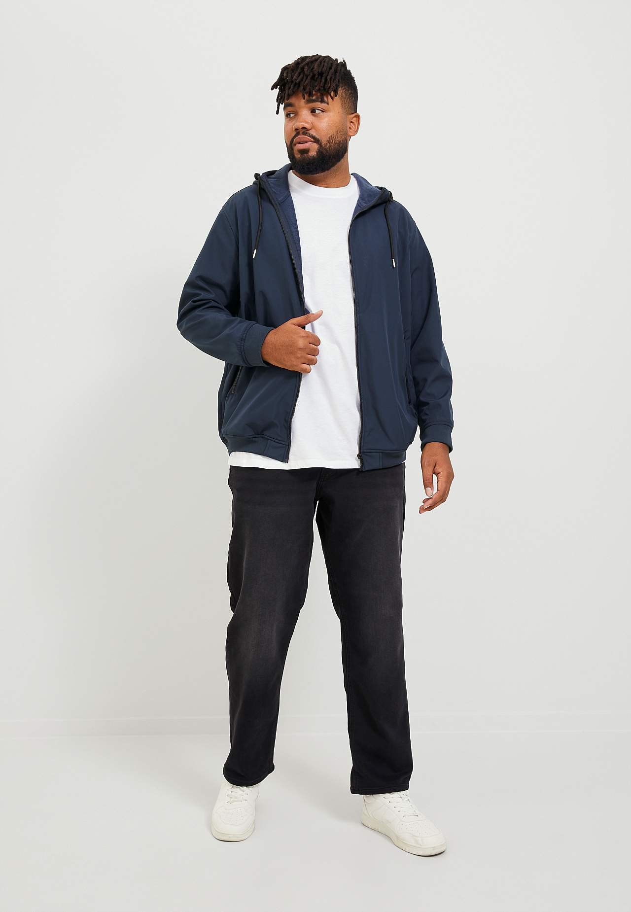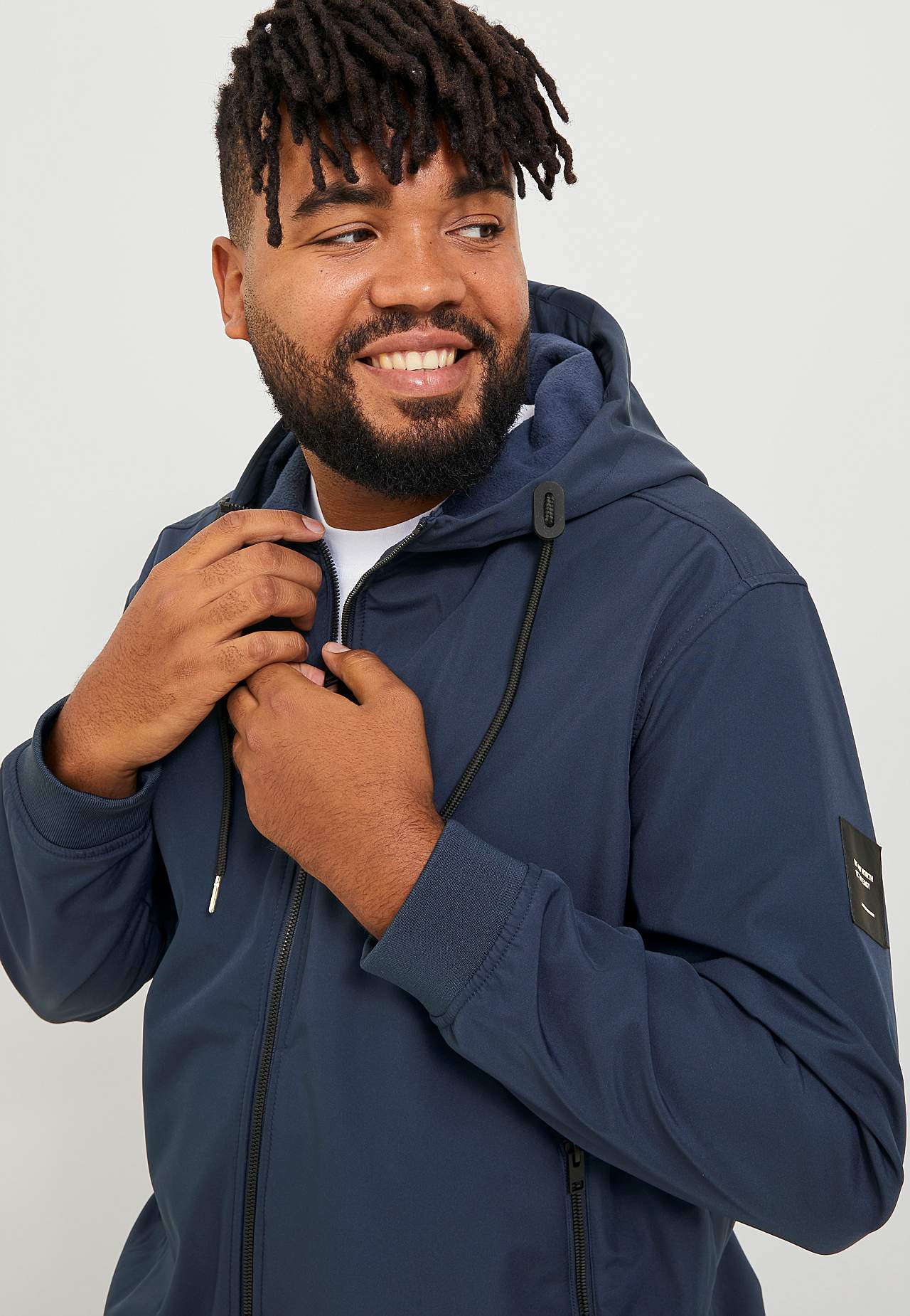 Softshelljacka med vattenavvisande egenskap. Rymlig passform. Vävt material med matt yta. Fastsydd huva med dragsko. Stängning med dragkedja. Snedställd sidoficka med dragkedja framtill. Långa ärmar med ribbstickade muddar. Rak nederkant med ribbstickad mudd. Mjuk insida. Ovadderad. Längd från axeln ca 80 cm i storlek 3XL.