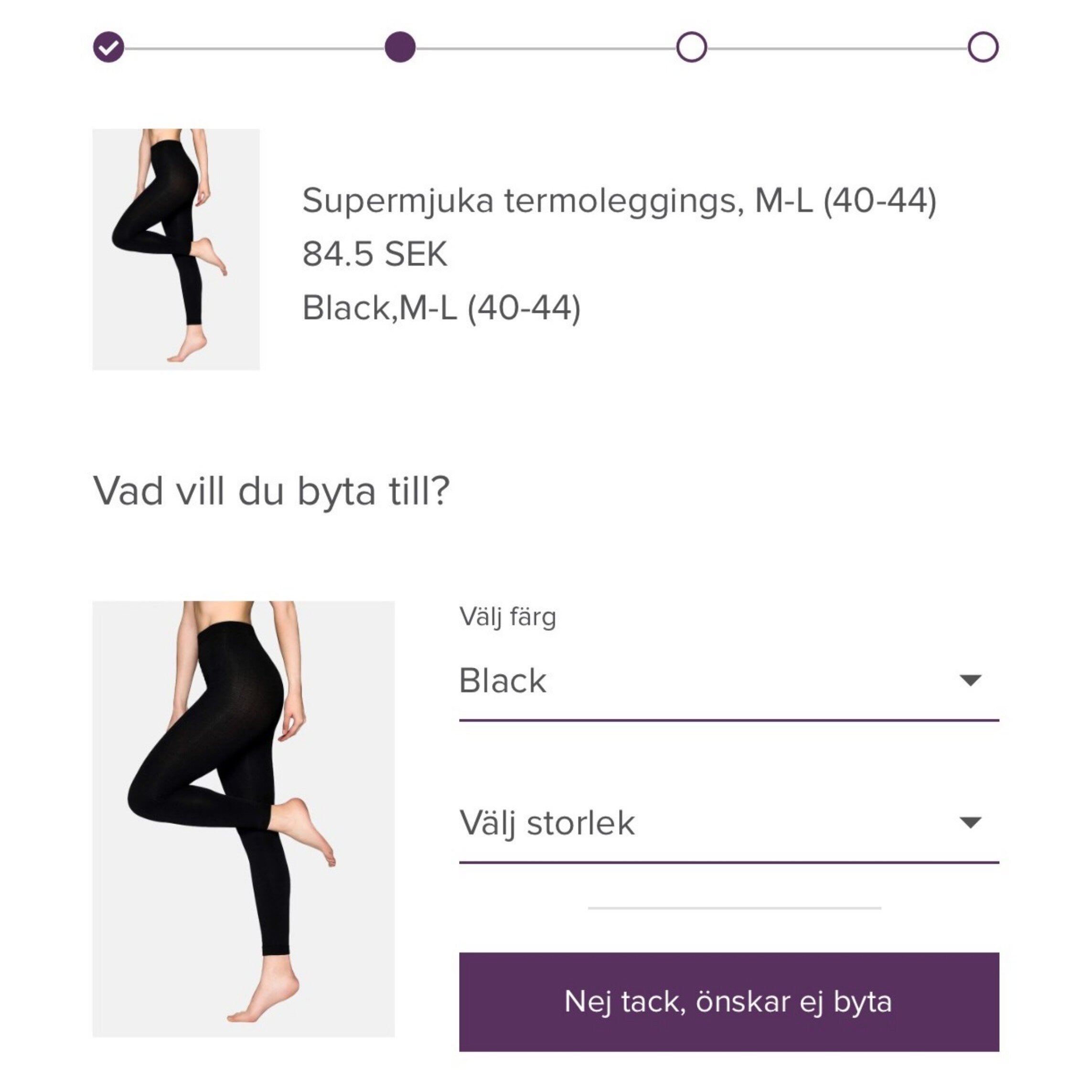Om du vill byta färg eller storlek - välj ny produkt i registreringen. Annars trycker du på ”Nej tack, önskar ej byta”. Tryck sedan på Fortsätt.