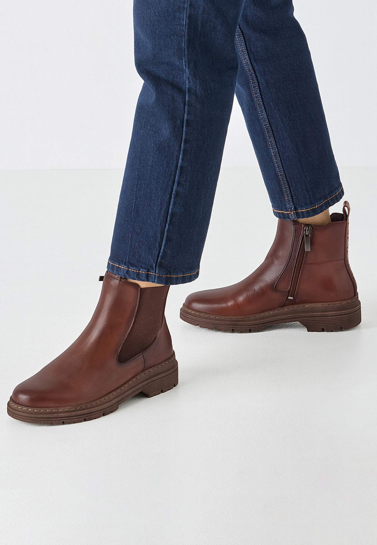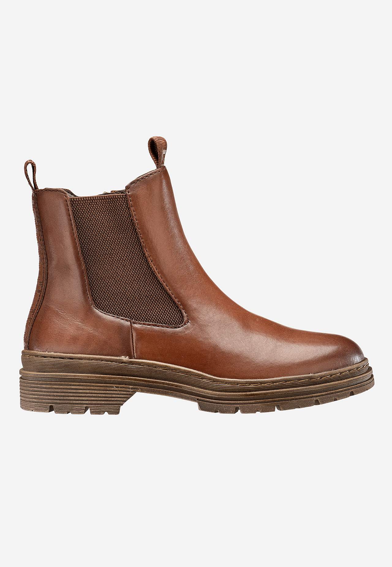 Känga i äkta skinn. Bred resårkil på utsidan. Dragkedja på insidan. Tamp fram och bak. Ton-i-ton stickningar. Rund tå. Foder i microfleece. Mjuk, bekväm sula. Yttersula med bra grepp. Ovansida i skinn. Insida med textil. Innersula i textil. Yttersula i syntet.