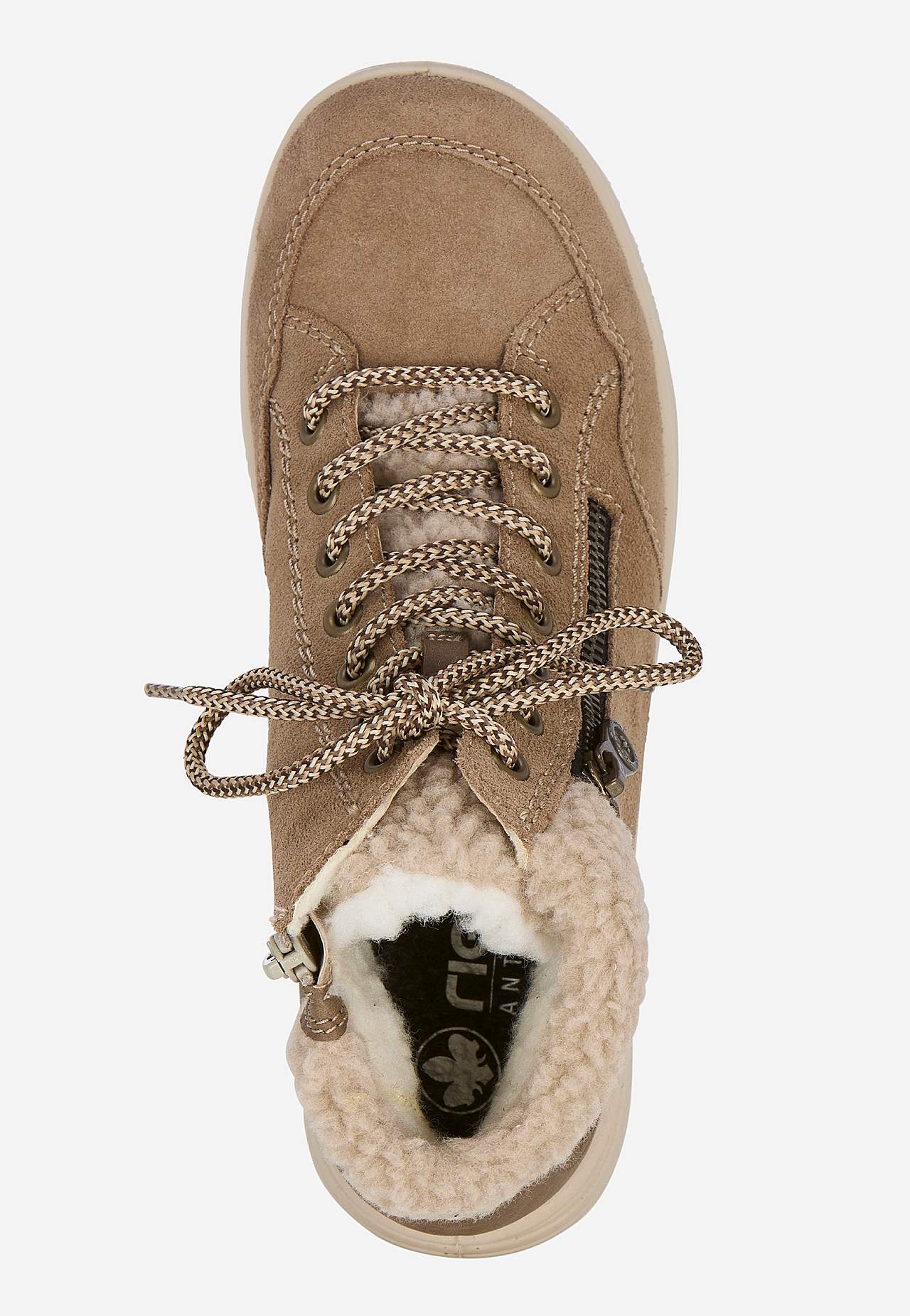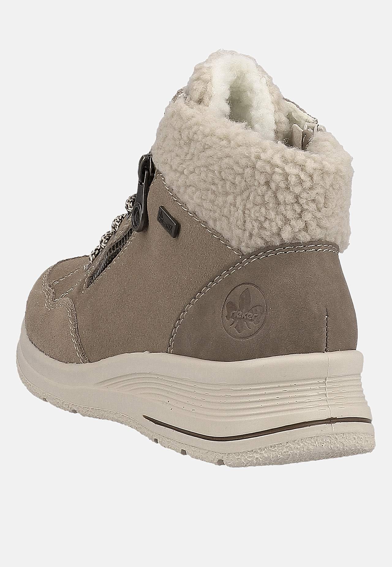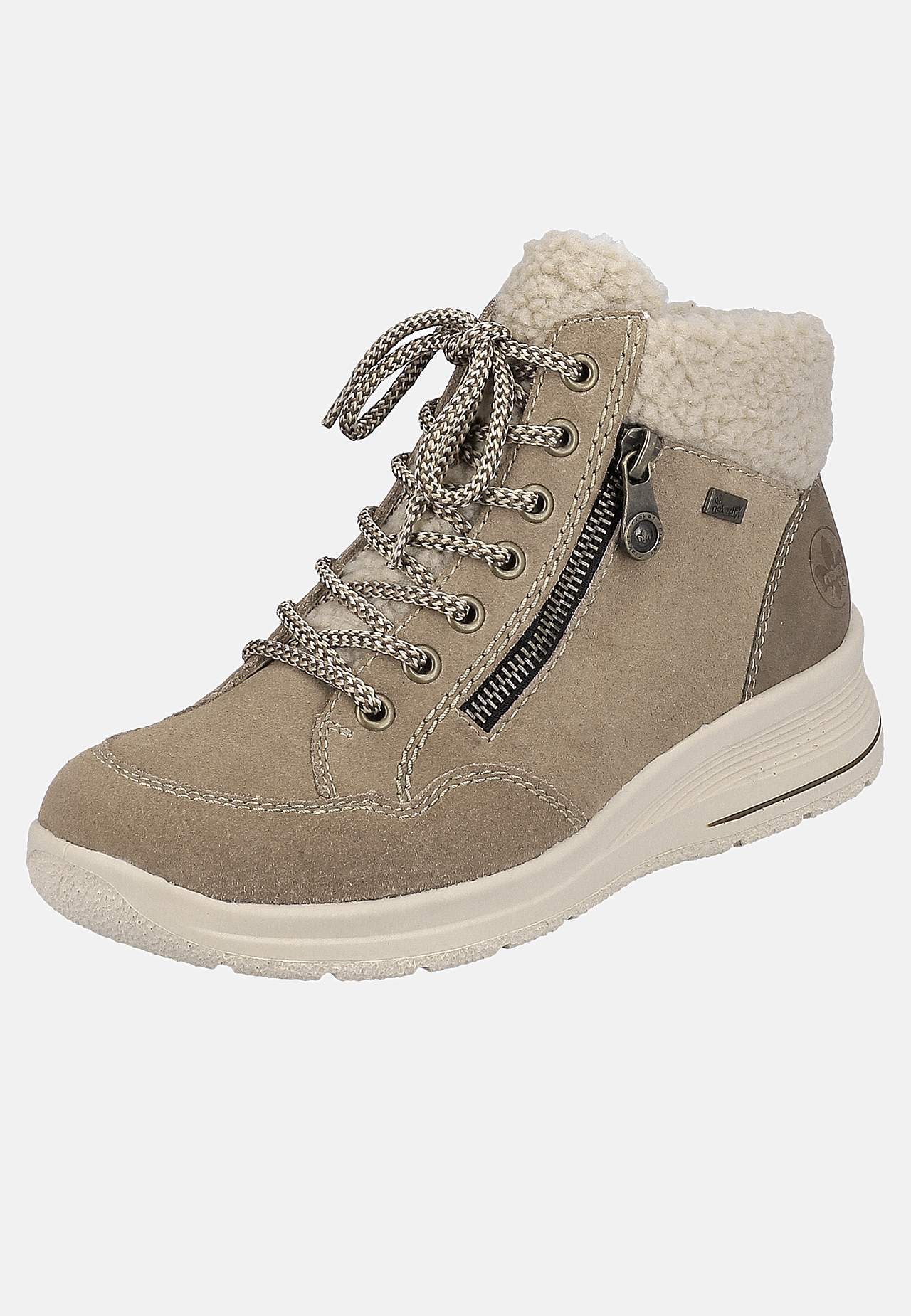 Vattenavvisande, varmfodrad mockakänga. Snörning på ovansidan. Dragkedja på insidan för enkel av-/påtagning. Dekorativ fuskdragkedja på utsidan. Mjukt, värmande, fluffigt, vitt foder. Beige fuskpälskant. Grov yttersula för bättre grepp. Rieker Antistress: Se nedan. RiekerTEX: Se nedan. Ovansida i skinn. Insida i textil. Inn... Läs mer