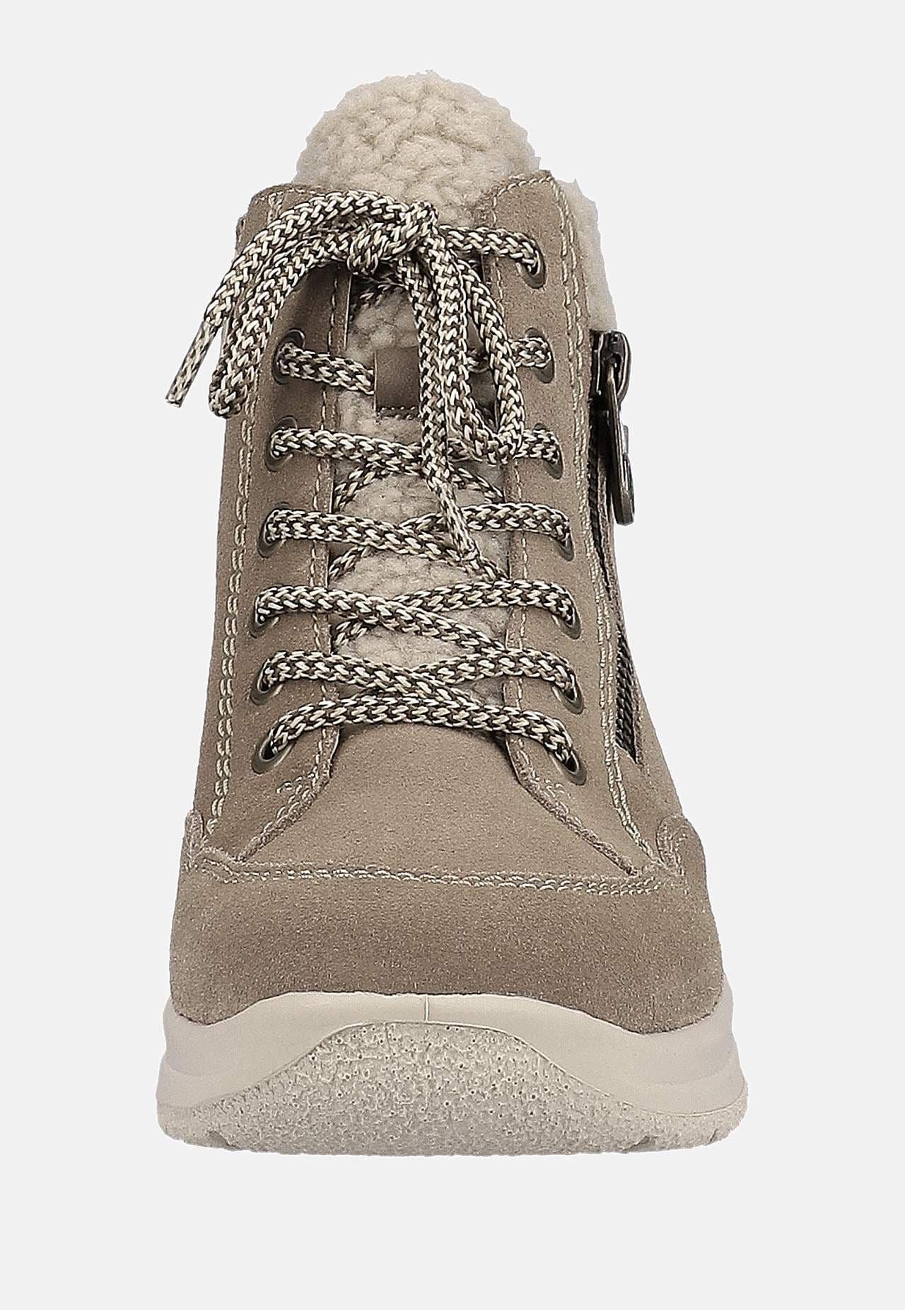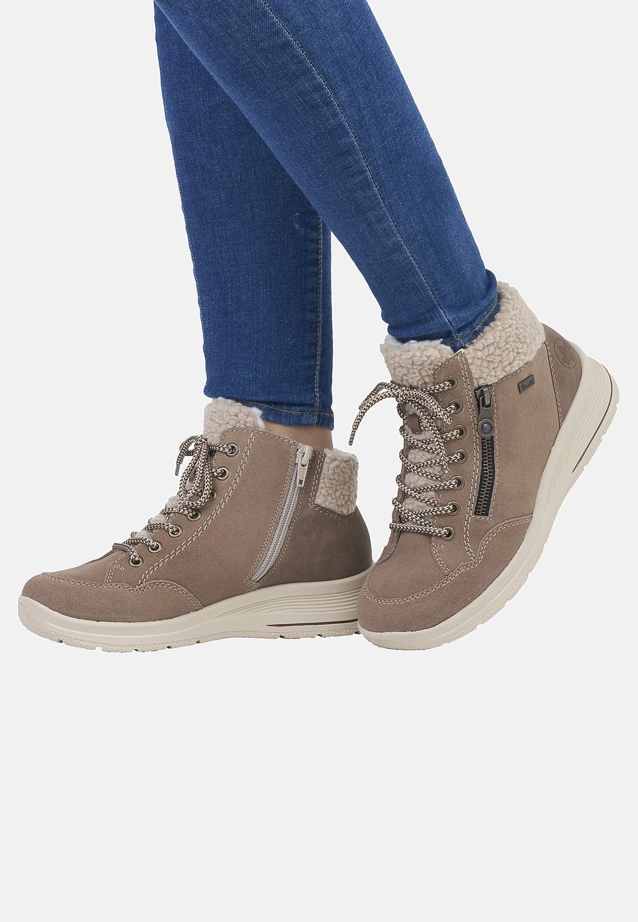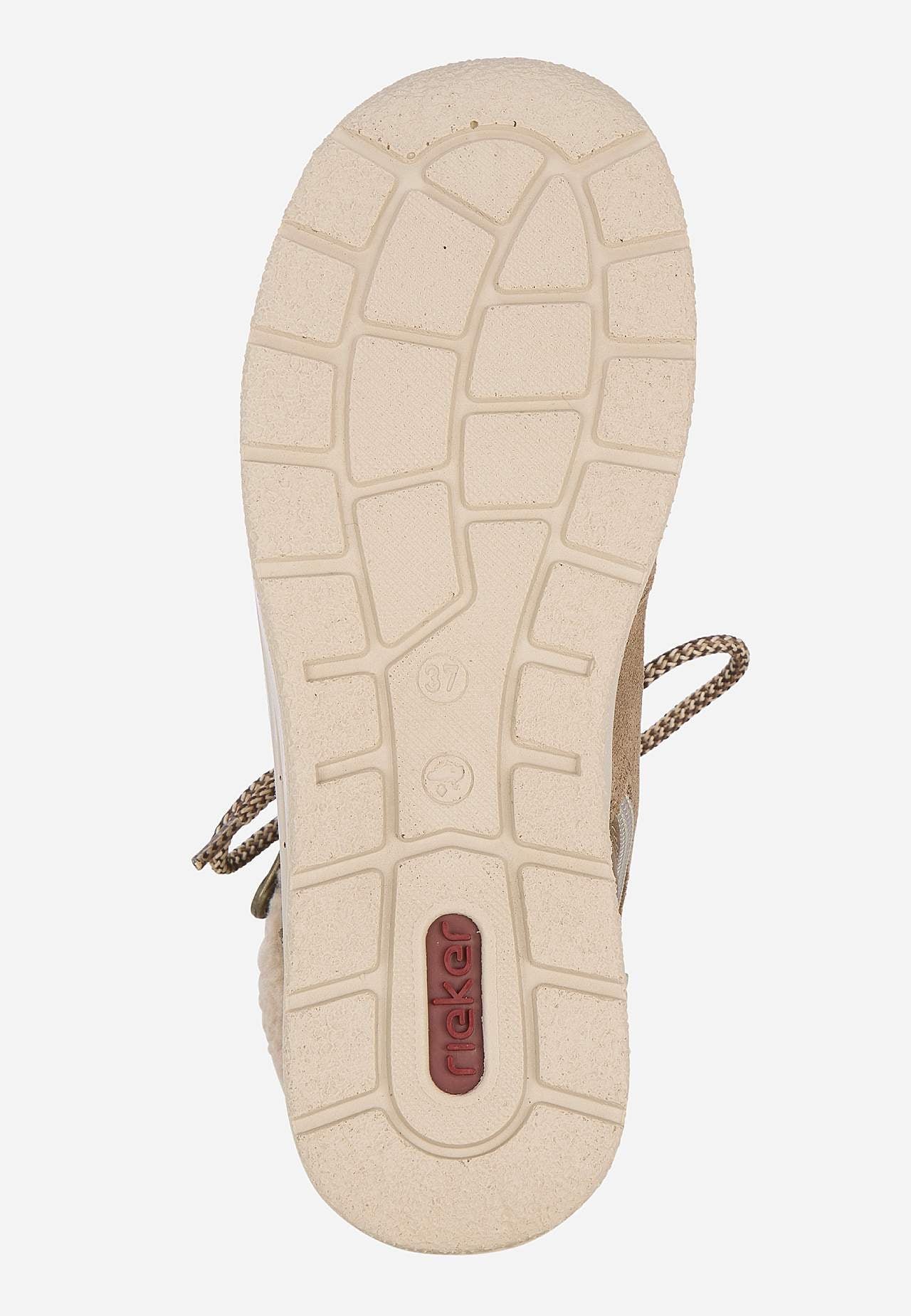 Vattenavvisande, varmfodrad mockakänga. Snörning på ovansidan. Dragkedja på insidan för enkel av-/påtagning. Dekorativ fuskdragkedja på utsidan. Mjukt, värmande, fluffigt, vitt foder. Beige fuskpälskant. Grov yttersula för bättre grepp. Rieker Antistress: Se nedan. RiekerTEX: Se nedan. Ovansida i skinn. Insida i textil. Inn... Läs mer