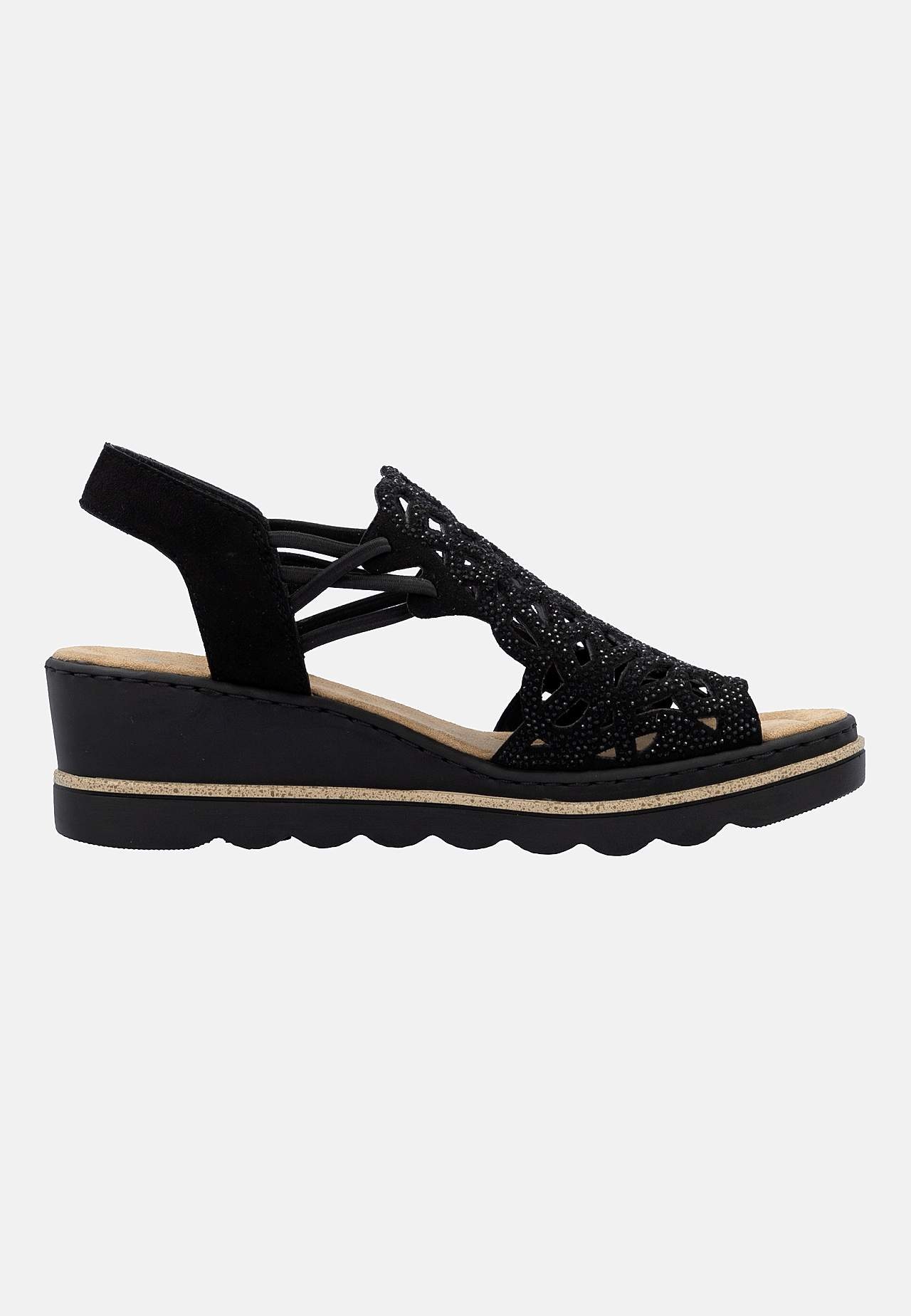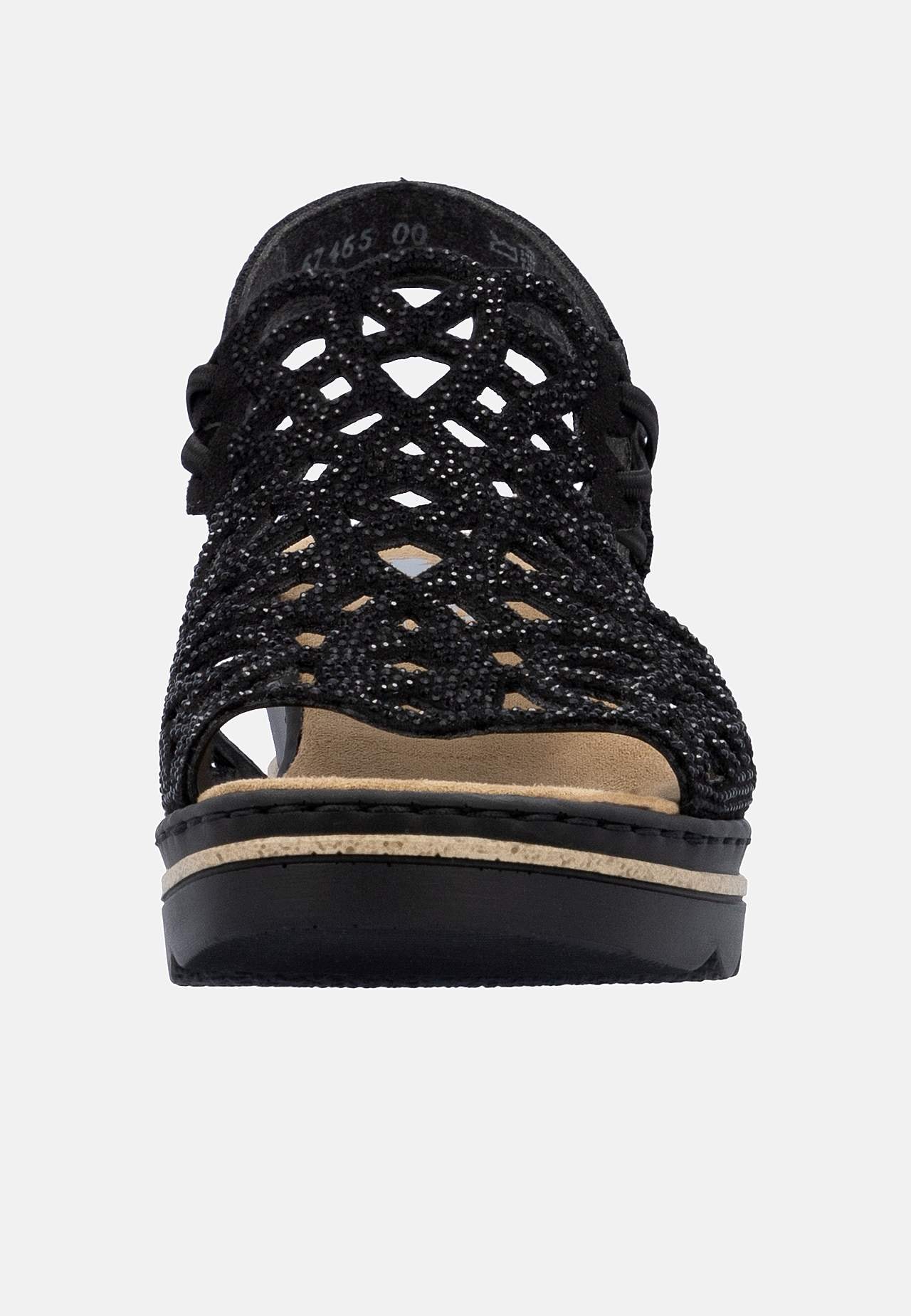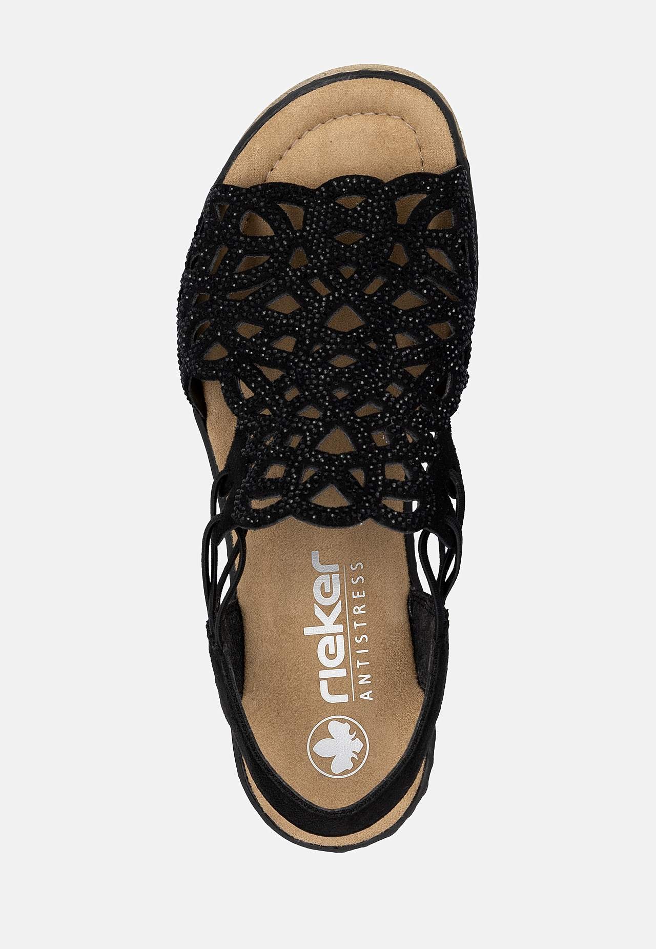 Sandalett med vackra strassdetaljer. Smala, elastiska band som gör den extra lätt att ta på och av. Rundad tå. Logo-detalj på utsidan. Bekväm innersula. Strukturerad yttersula med bra grepp. Passar lika bra till vardags som till fest. Rieker Antistress: Se nedan. Ovansida i textil. Insida i syntet och textil. Innersula i sy... Läs mer