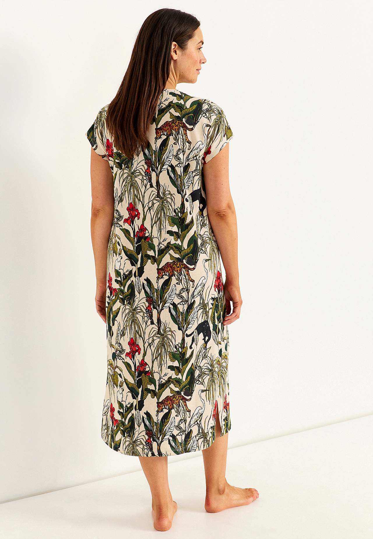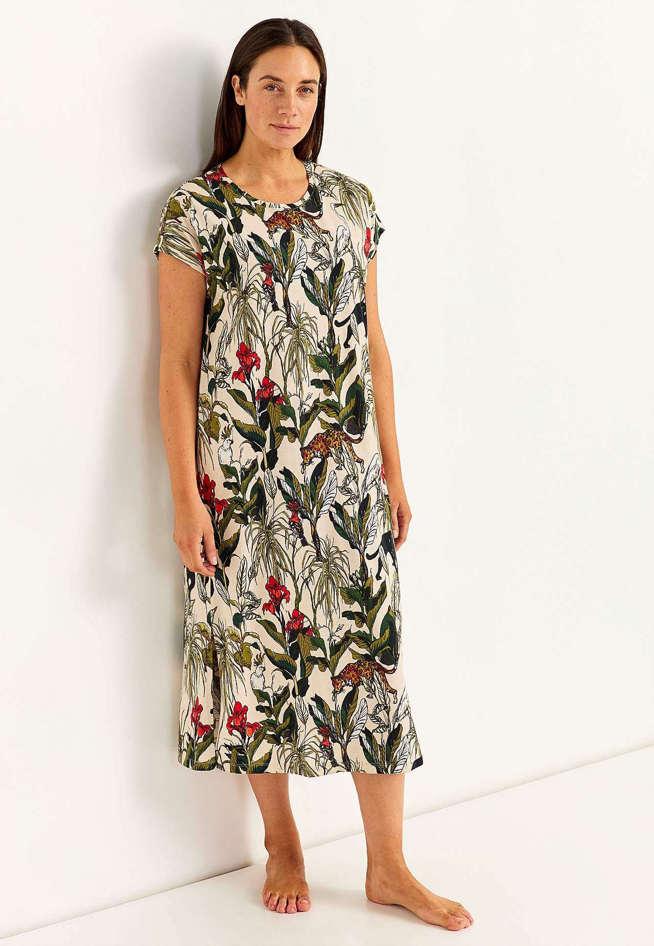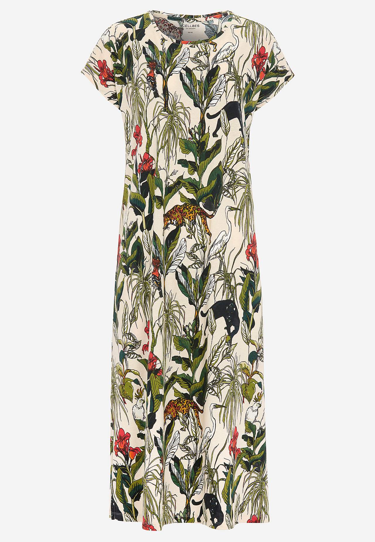 Mjuk bomullstrikå. Rund hals. Korta holkärmar. Rak nederkant med slitsar i sidorna. Längd från axel ca. 124 cm i alla storlekar.