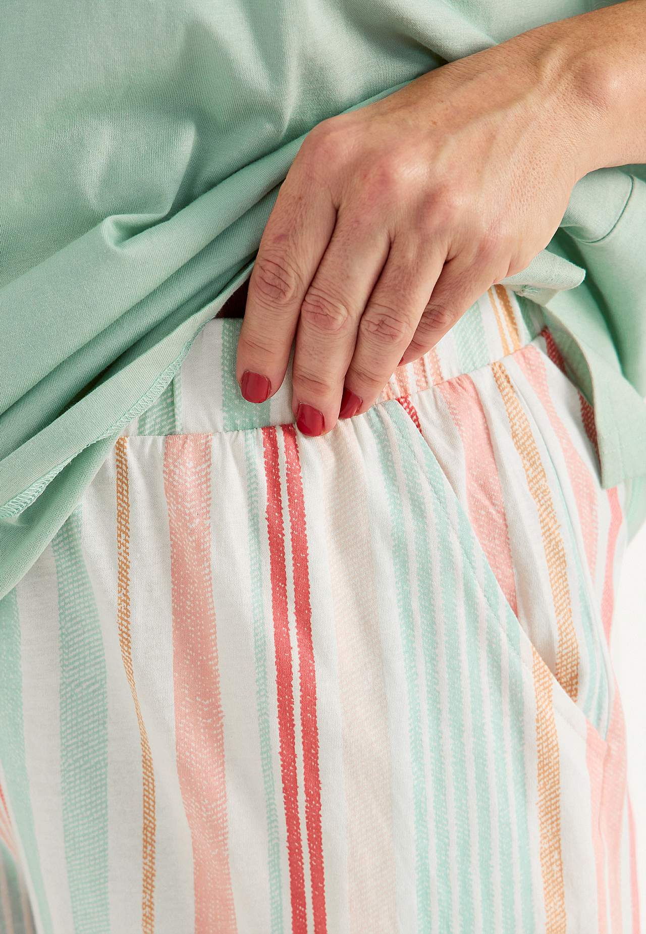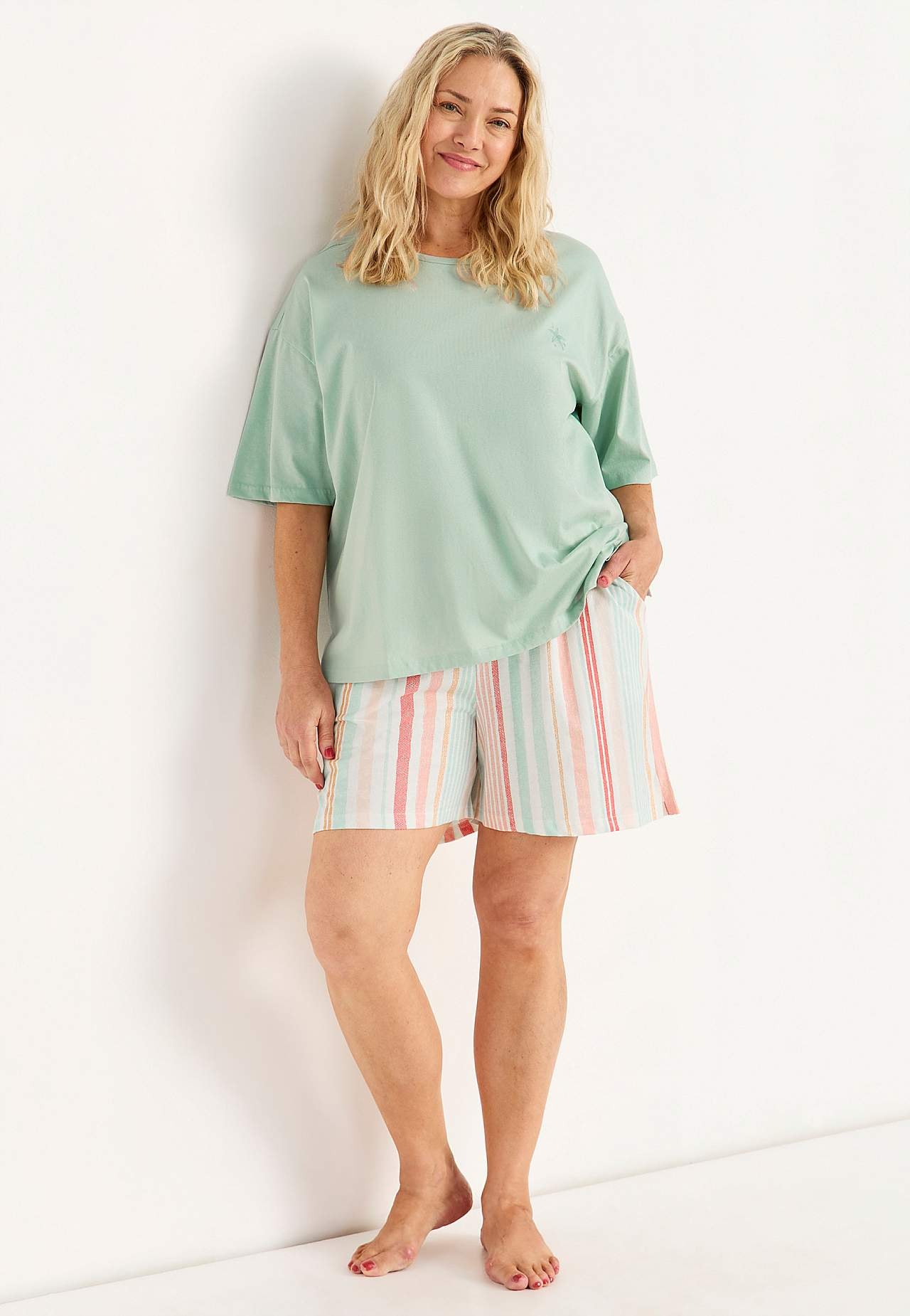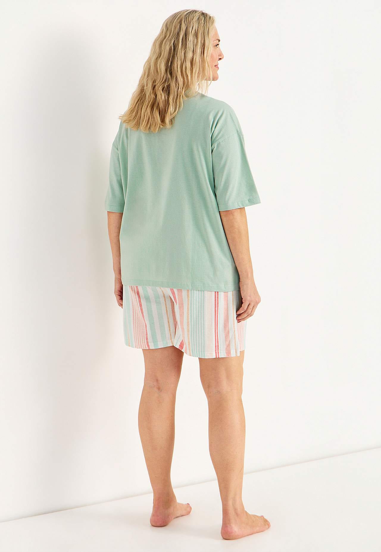 Pyjamasset med kortärmad topp och shorts. Mjuk, ekologisk bomull. Normal passform. Överdel: T-shirt med lätt nedhasad axel. Liten, ton-i-ton broderidetalj på vänster sida. Korta ärmar. Rak nederkant med slits i sidorna. Rygglängden följer storleken ca 63-73 cm. Nederdel: Shorts med vidd. Mjukt resårband i midjan. Två sidofi... Läs mer