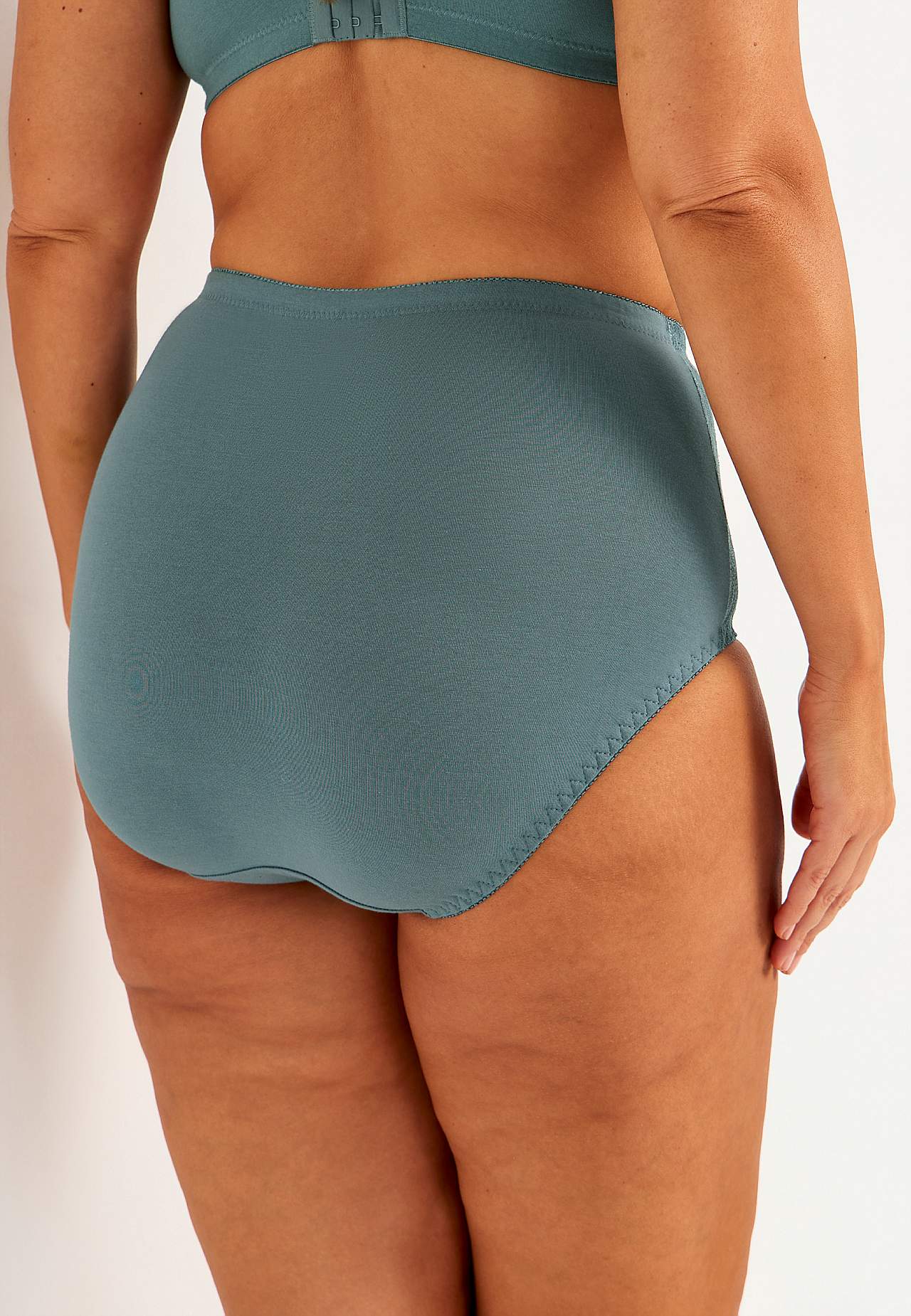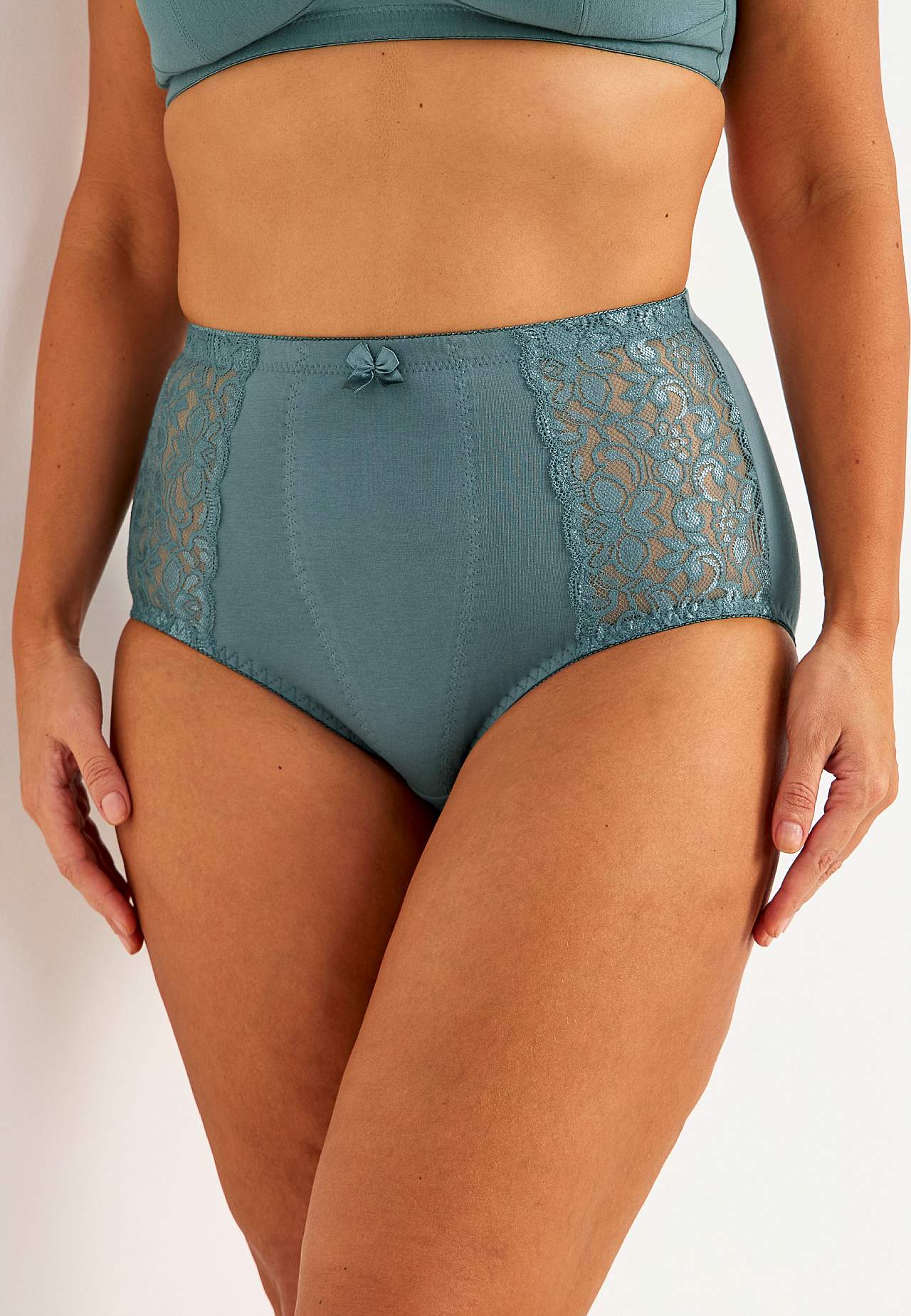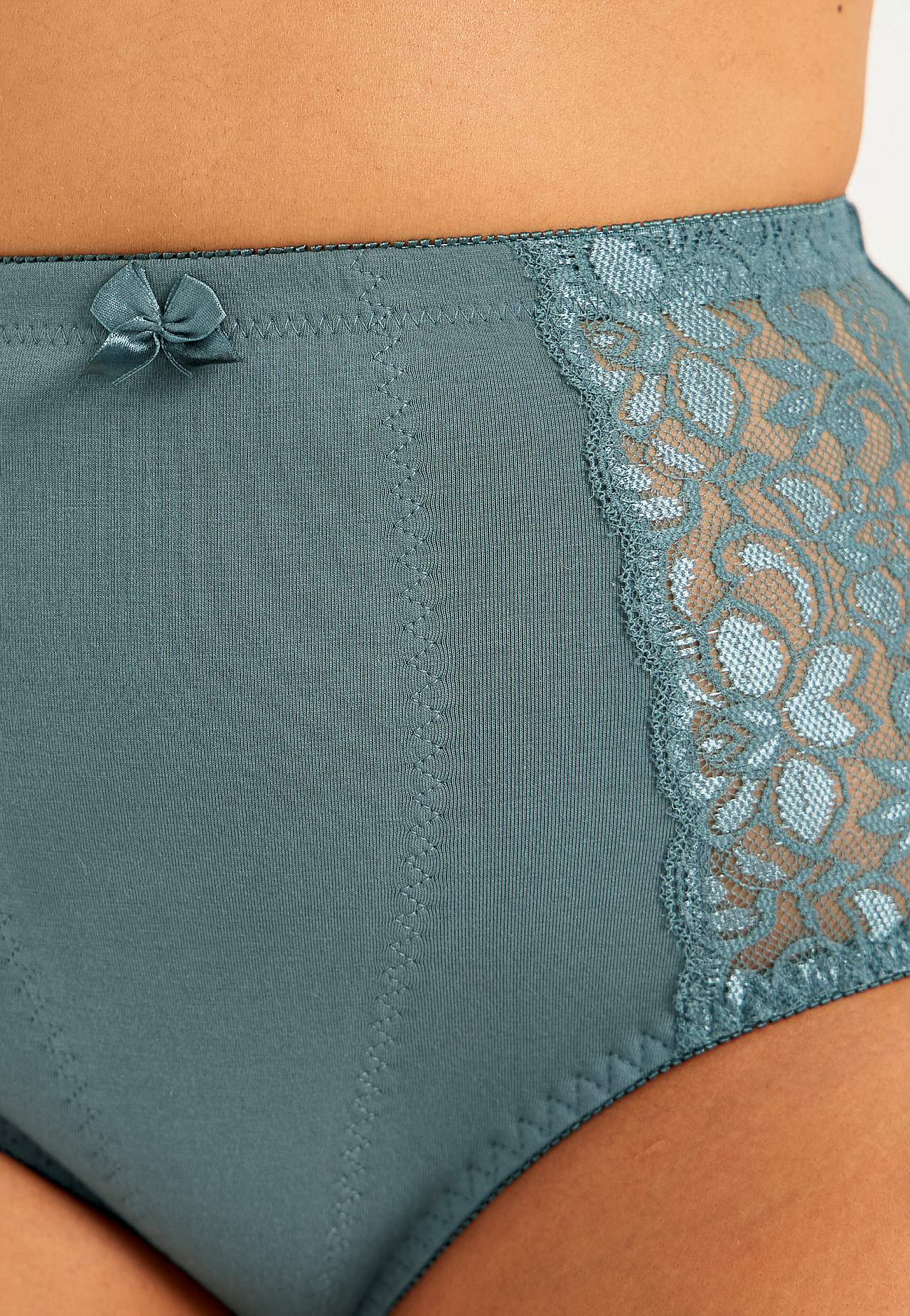 Förstärkt framstycke med lätt formande effekt. Modell med hög midja. Paneler med blommönstrad spets i sidorna. Mjuk resår i midjan och benöppningarna. Bomullsfodrad gren.